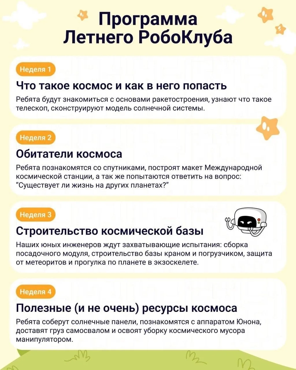 💫 Летний РобоКлуб — это увлекательное путешествие по освоению космоса, исследование передовых технологий и захватывающих возможностей внеземного пространства. Мы предлагаем детям и подросткам погрузиться в мир космонавтики и освоения далеких миров, вдохновляя их интерес к науке, технике и инновациям 💡🧑🔬