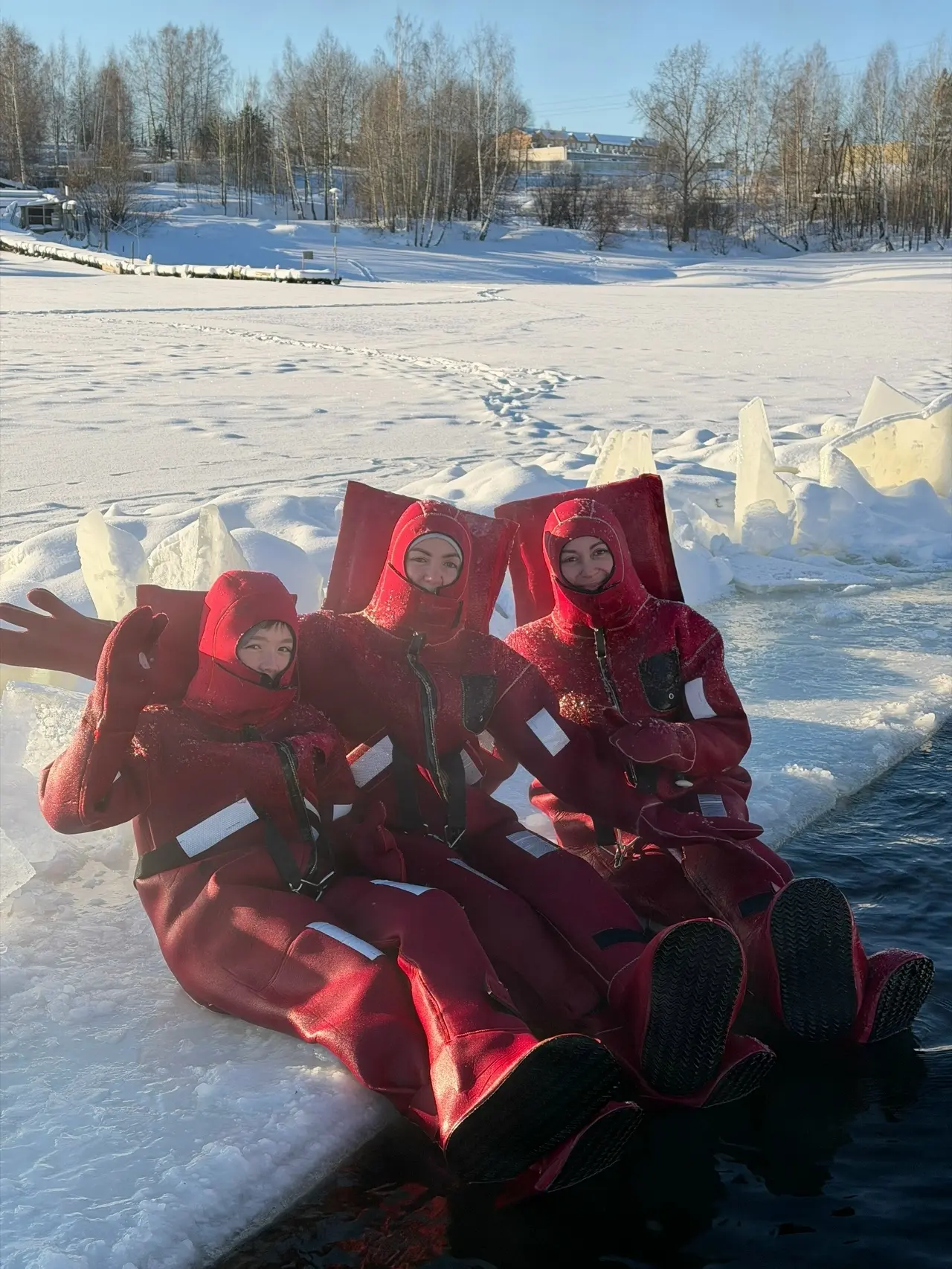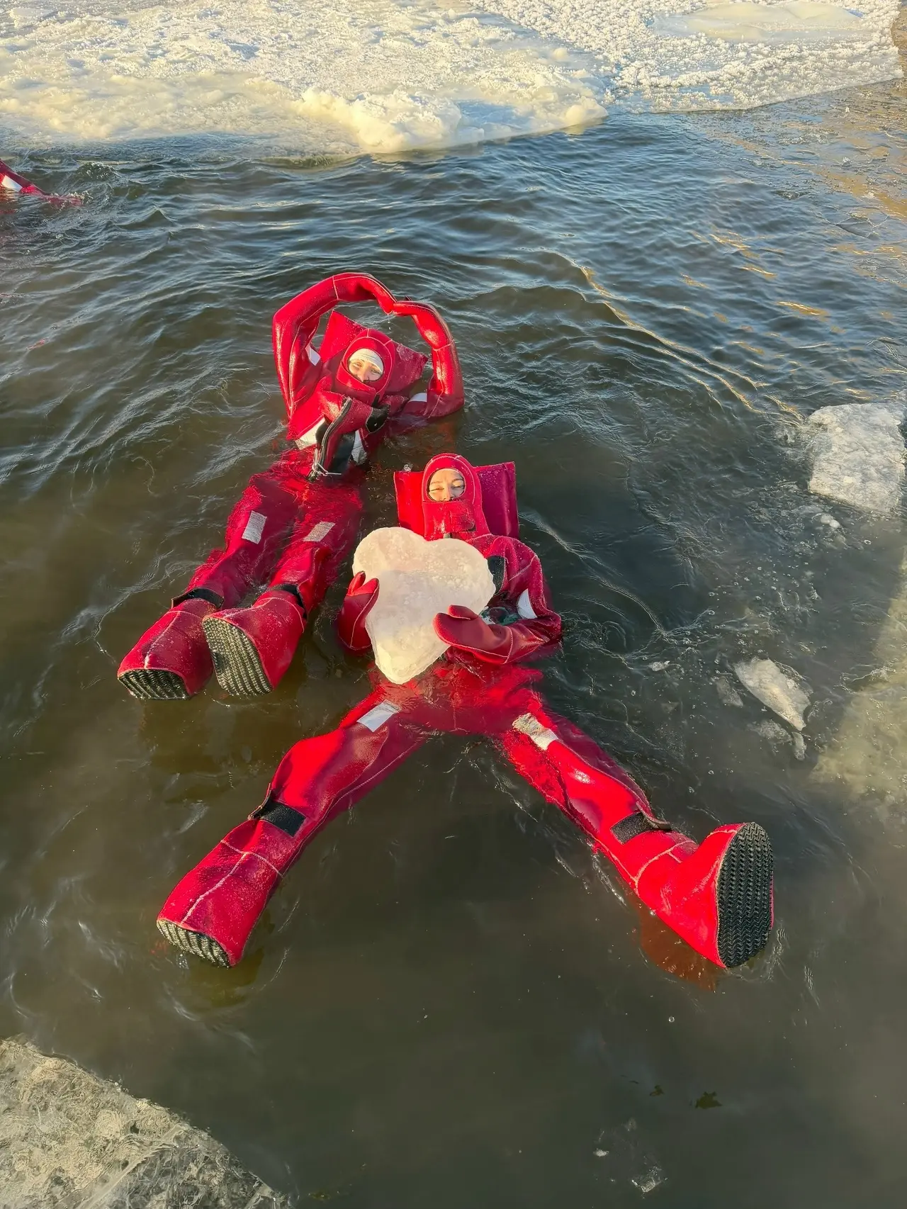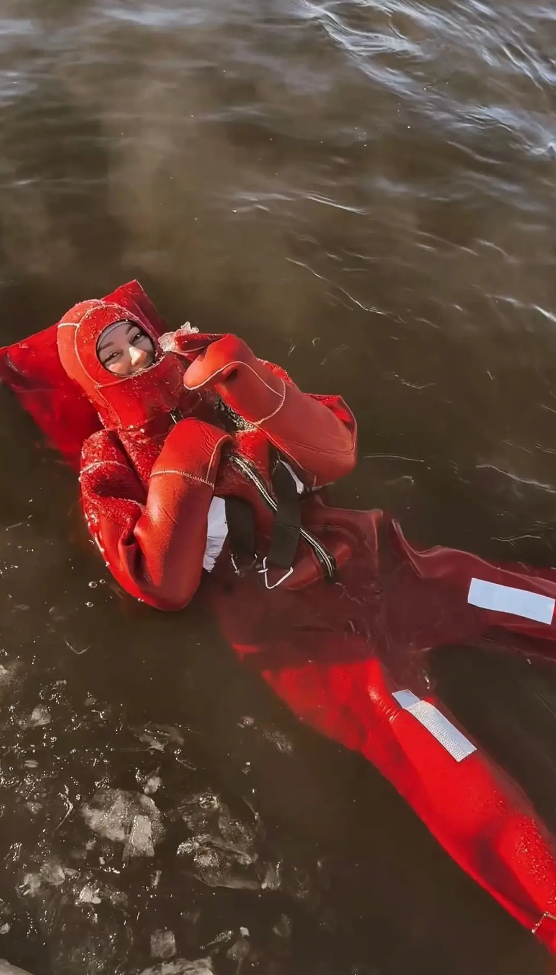 Айс-флоатинг в Перми - это плавание в ледяной воде в специальном гидрокостюме. Гидрокостюм представляет собой ярко-оранжевый скафандр с открытым лицом и встроенной подушкой для головы. В нём можно находиться в холодной воде до 13 часов, полностью защищаясь от холода.