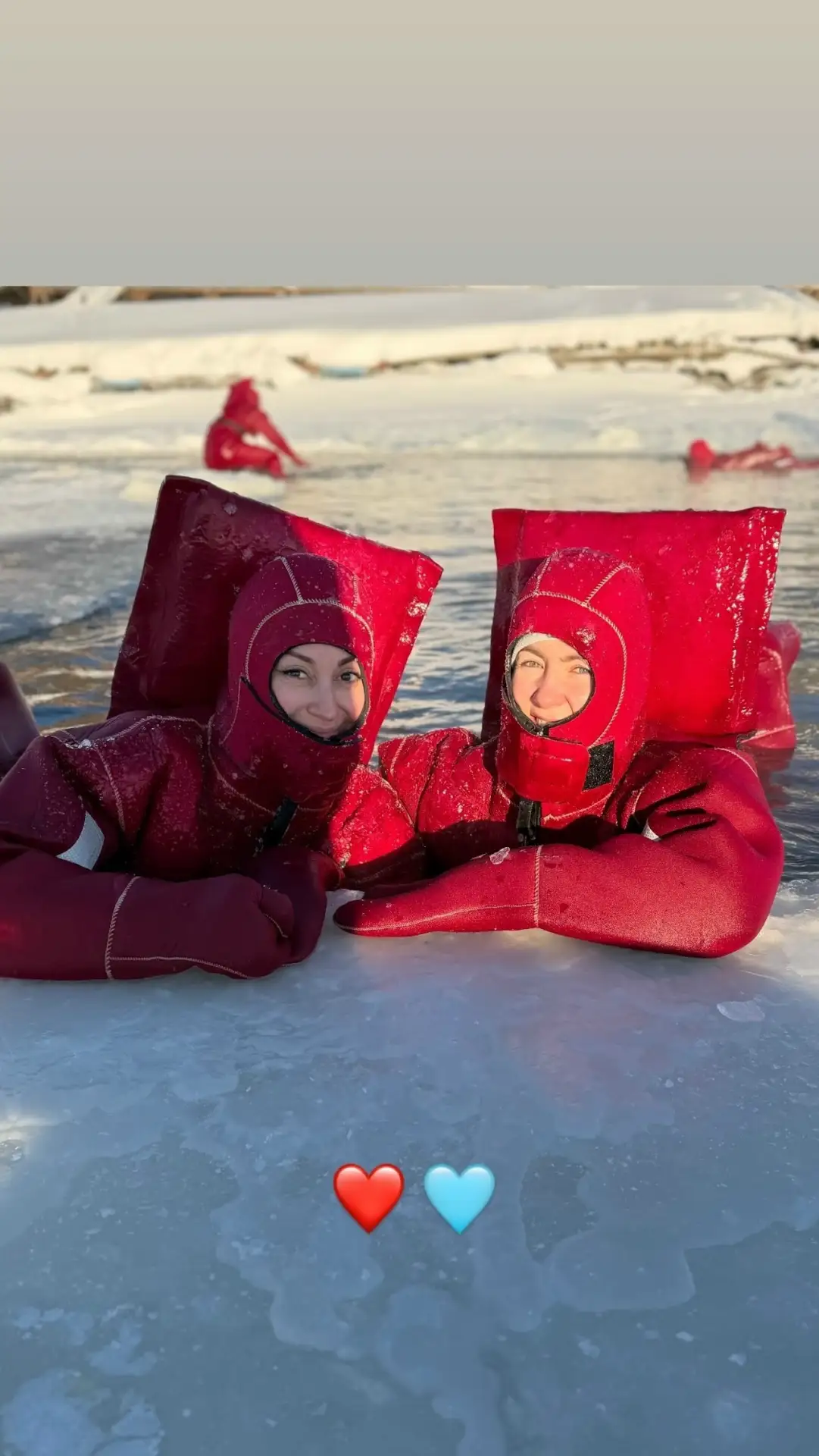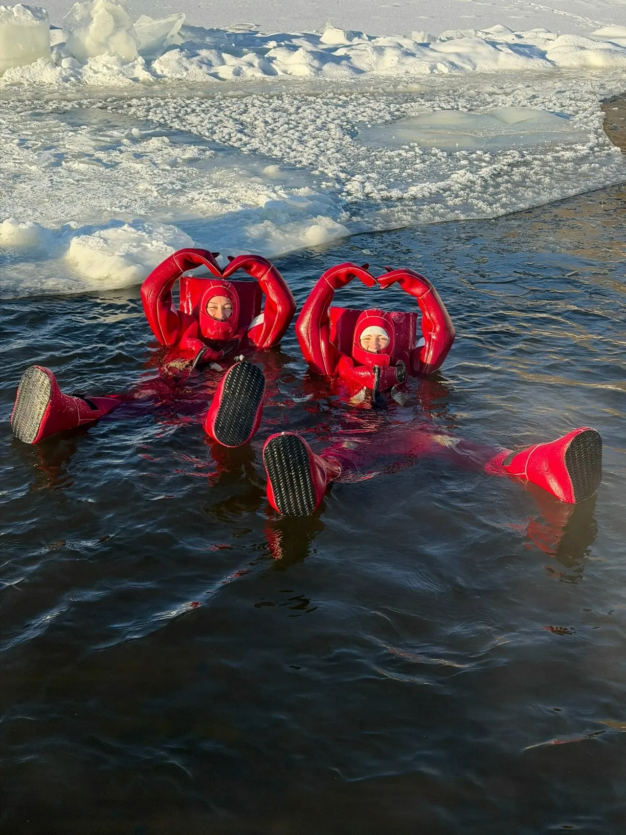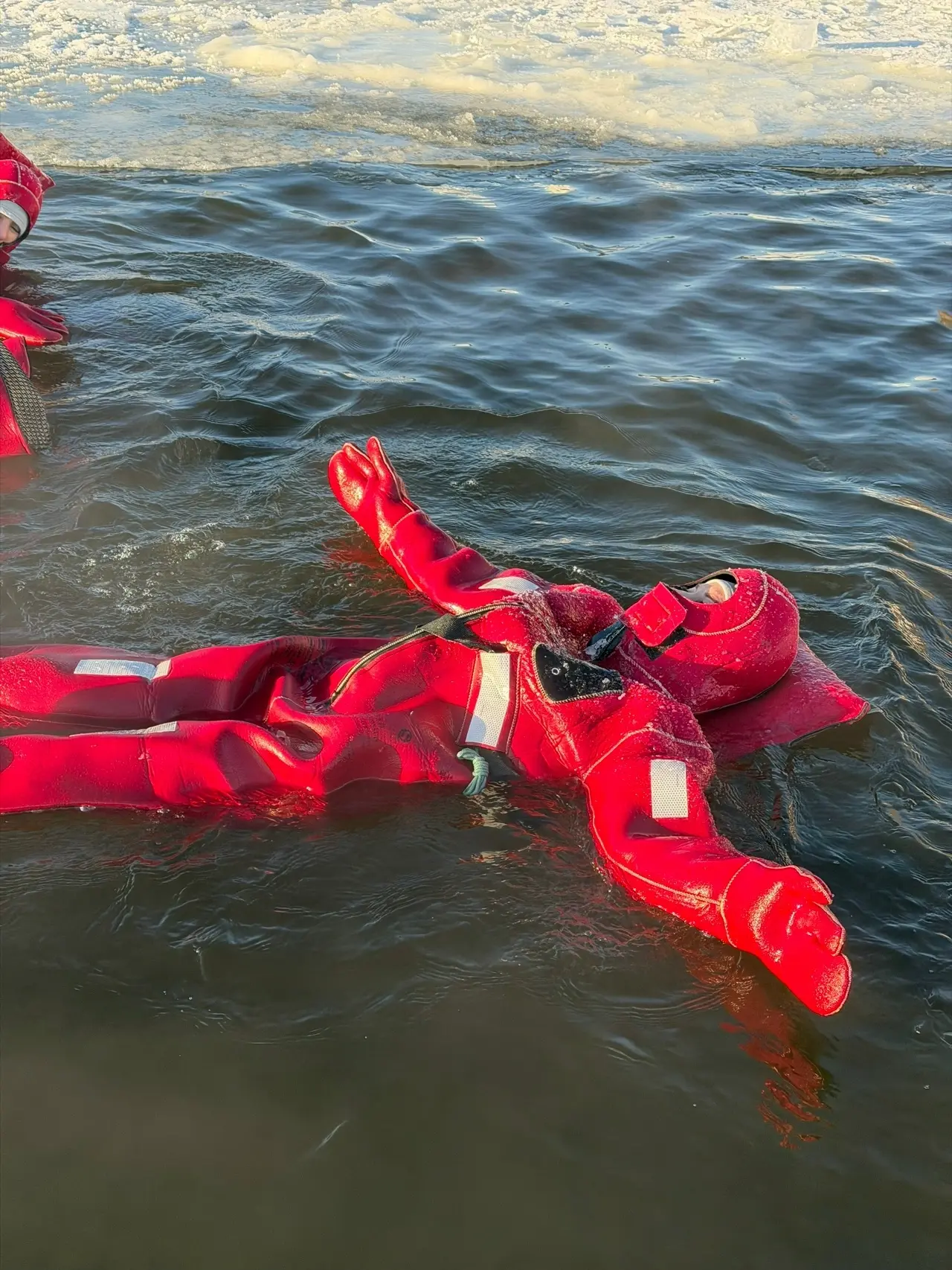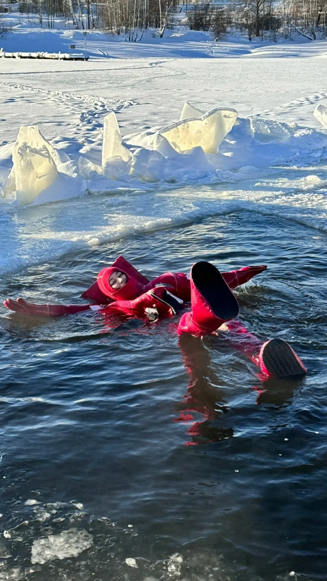 Айс-флоатинг в Перми - это плавание в ледяной воде в специальном гидрокостюме. Гидрокостюм представляет собой ярко-оранжевый скафандр с открытым лицом и встроенной подушкой для головы. В нём можно находиться в холодной воде до 13 часов, полностью защищаясь от холода.