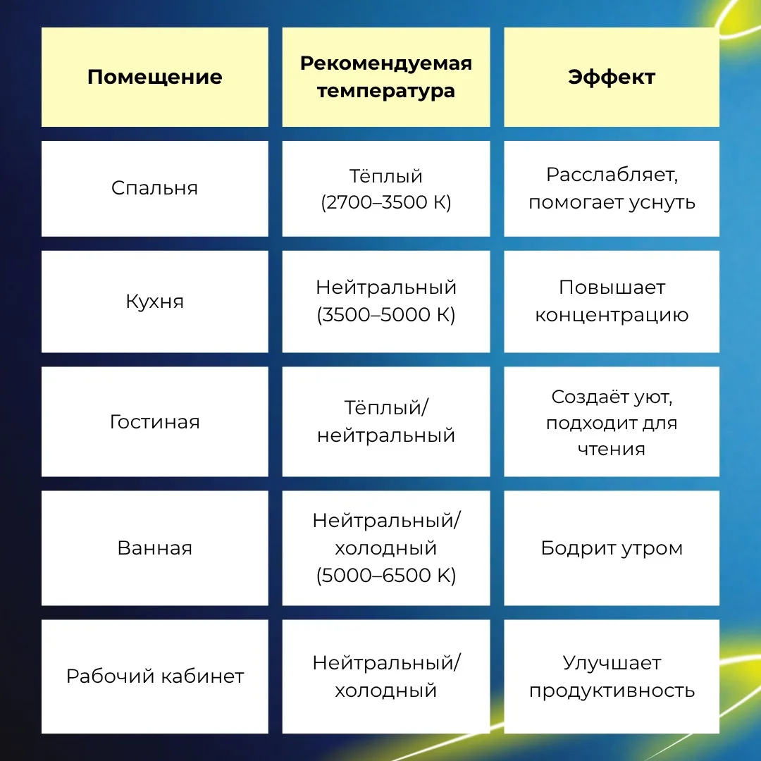 Температура света измеряется в Кельвинах (К) и определяет оттенок освещения: