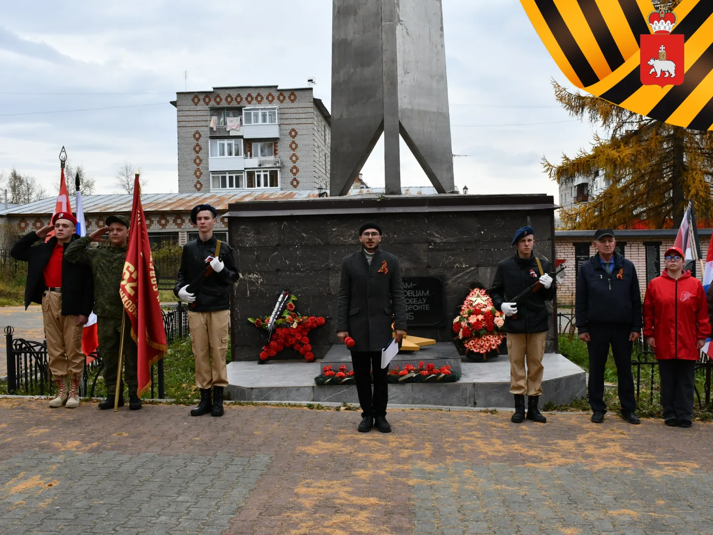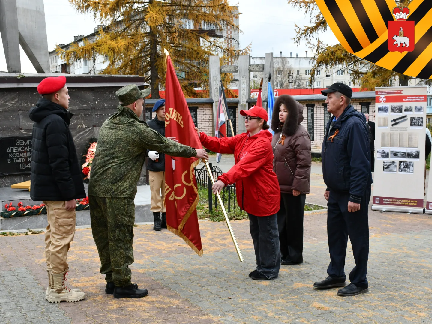 Сегодня, 11 октября, копию знамени приняли ветеран СВО, гвардии-сержант Сергей Архипов и юнармеец Никита Александрович.