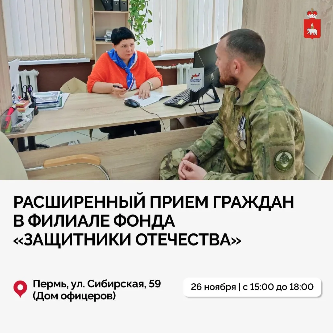 Краевой филиал фонда «Защитники Отечества» приглашает в Дом офицеров Пермского гарнизона на расширенный прием. Здесь граждане смогут получить социальную, консультационную и юридическую помощь.
