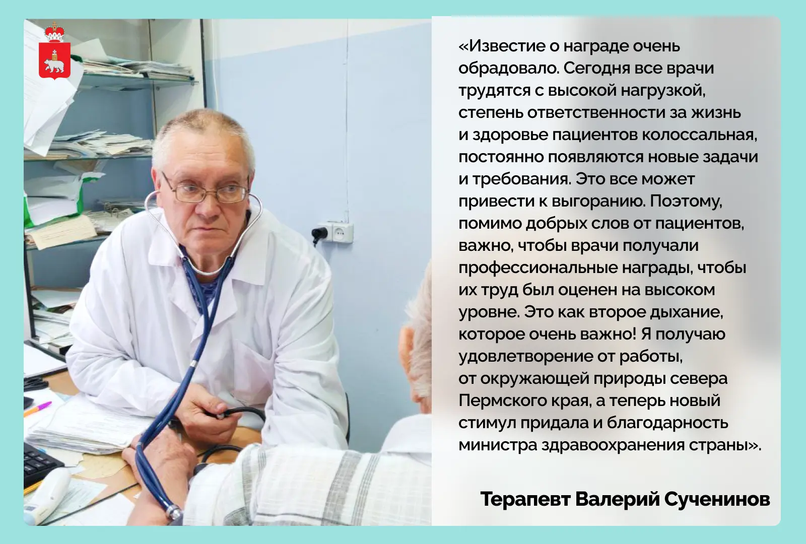 • Благодарность министра объявили 103 медикам. Среди них участковый терапевт Красновишерской центральной районной больницы Валерий Сученинов. Его преданность профессии вдохновила сына на выбор профессии фельдшера и других членов семьи на медицинскую карьеру.