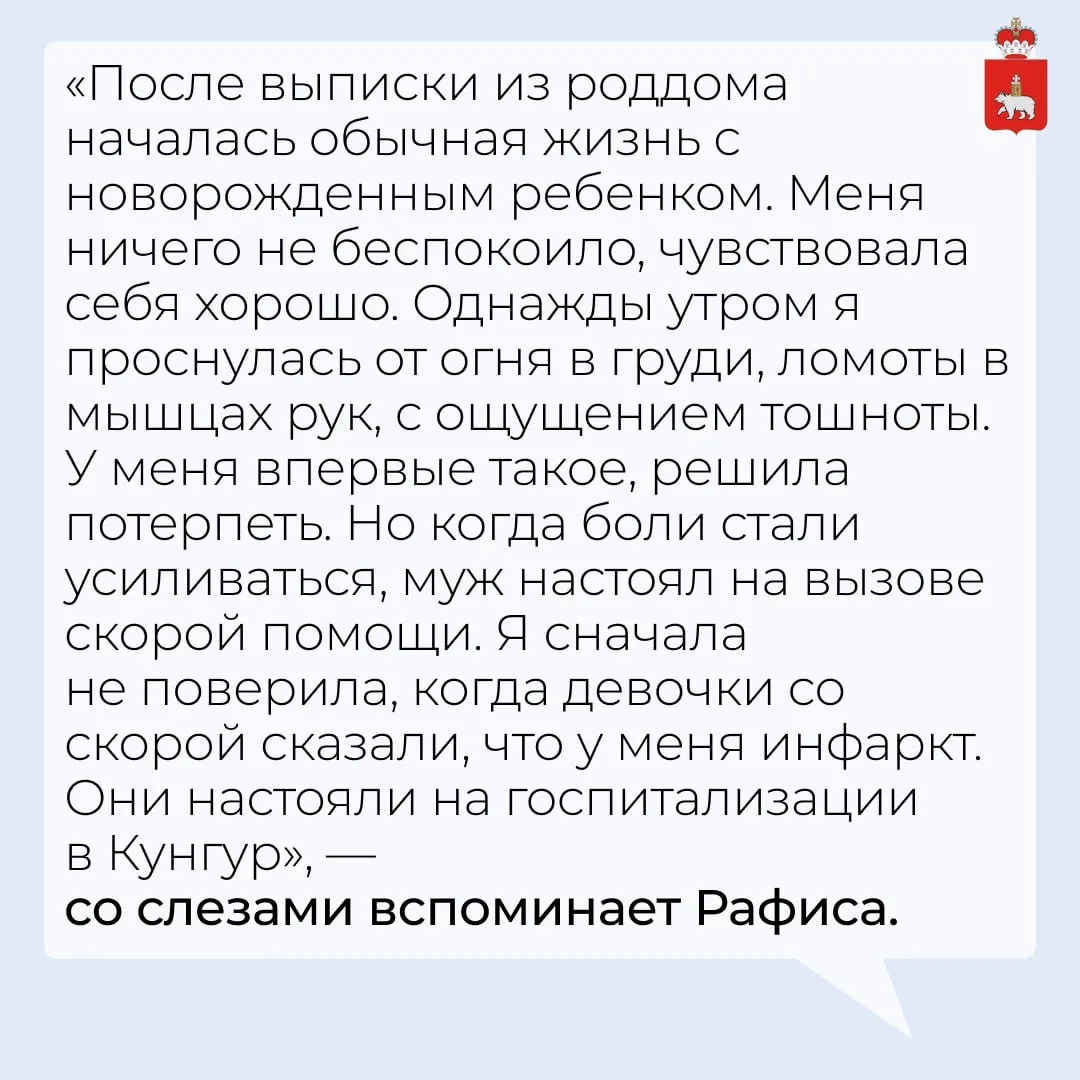 Реаниматологи приняли решение эвакуировать женщину в Пермь, несмотря на риск. В Кардиодиспансере её ждала операция, подтвердившая диагноз – острый коронарный синдром. Проведённое стентирование восстановило кровоток, и после трёх дней в реанимации Рафиса была выписана.