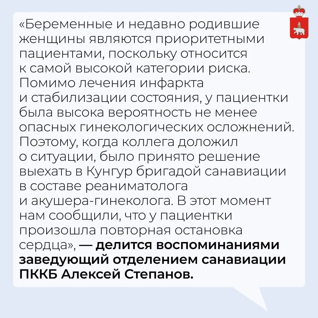 В отделении интенсивной терапии находился реаниматолог санавиации Павел Семенов, который сообщил о тяжёлом состоянии пациентки с острым инфарктом миокарда после кесарева сечения. В дороге врачи санавиации получили сообщения о трёх остановках сердца, но смогли вернуть её к жизни и стабилизировать состояние.