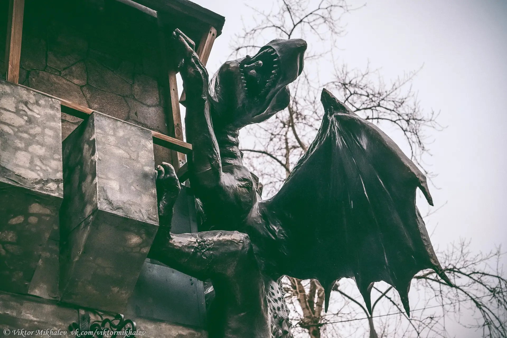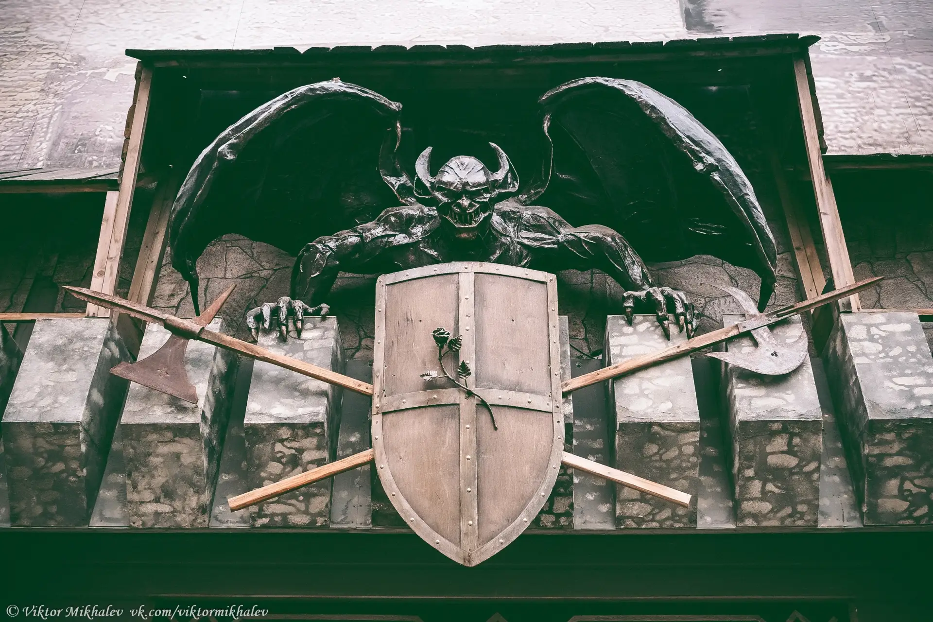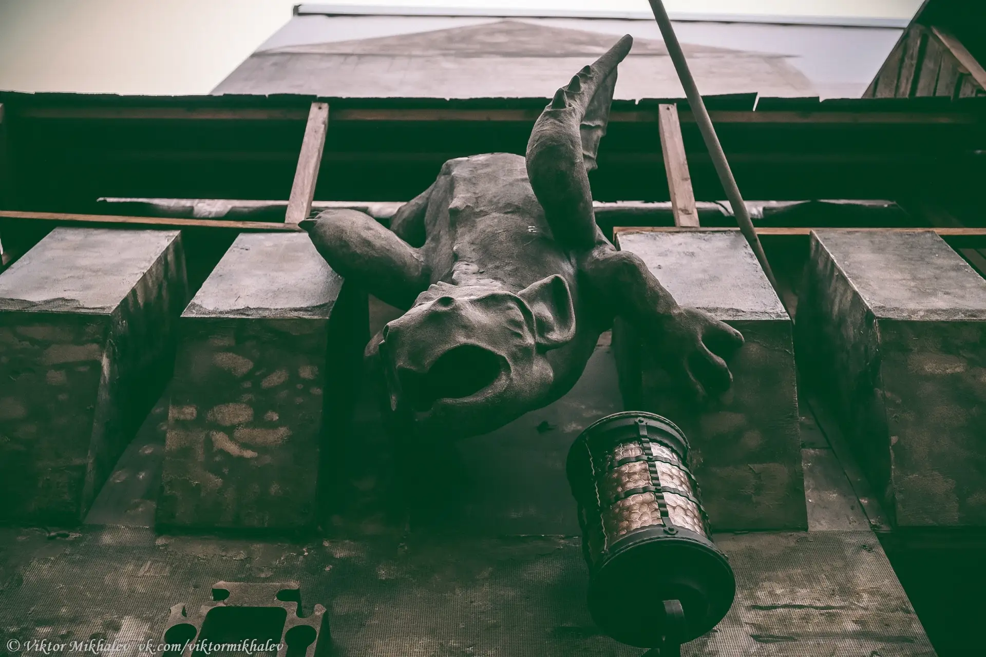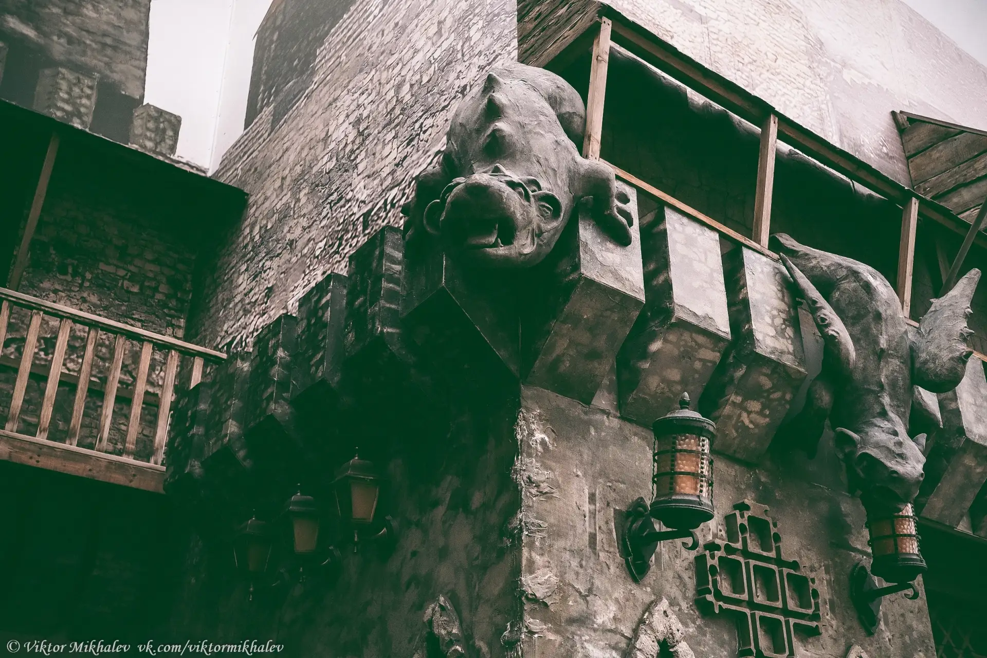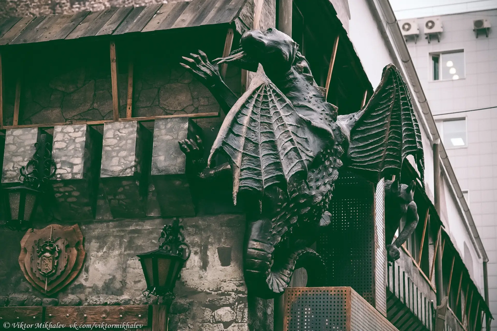 Гуляешь в центре современной и многоэтажной Перми, а тут раз – и ирландский замок кельтов с чудовищами перед тобой. Уличные декорации возле театра «У Моста».
