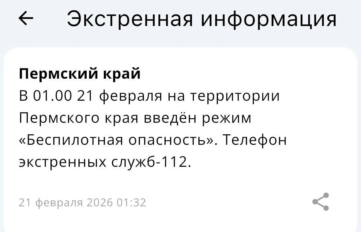 В Пермском крае сохраняется введенный рано утром 21 февраля режим «Беспилотная опасность».