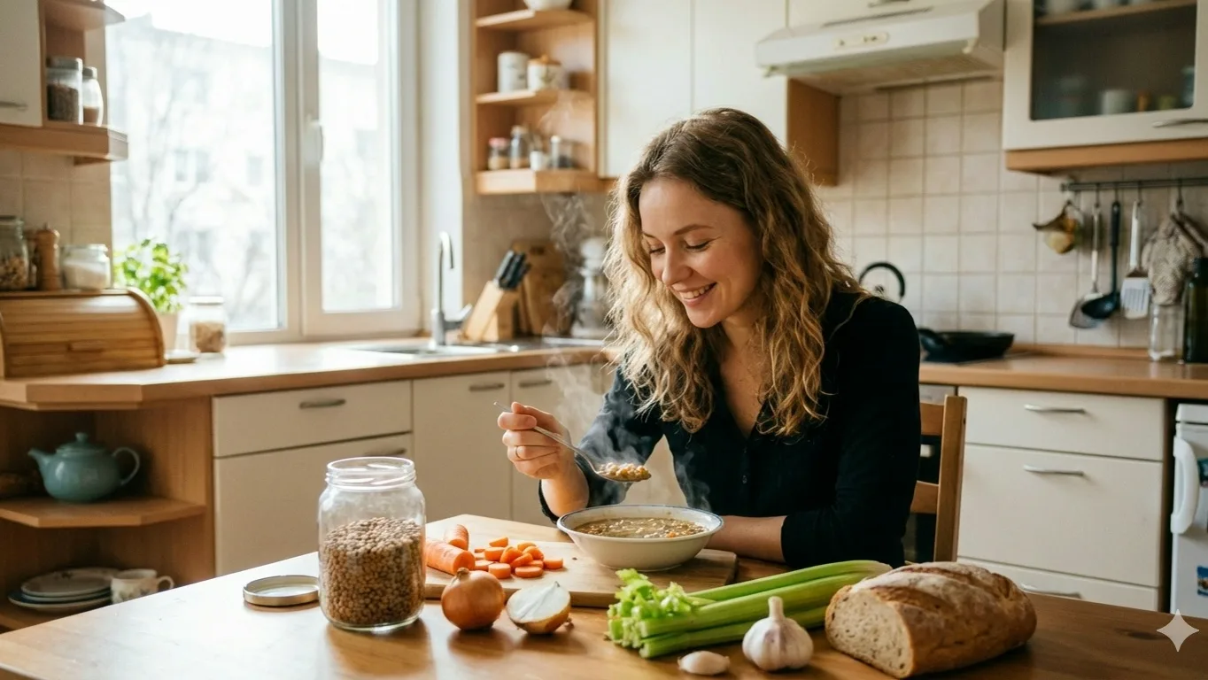 - Растительный белок чечевицы помогает сохранять мышечную массу. При этом, в отличие от мяса, такой суп не перегружает сердечно-сосудистую систему насыщенными жирами.
