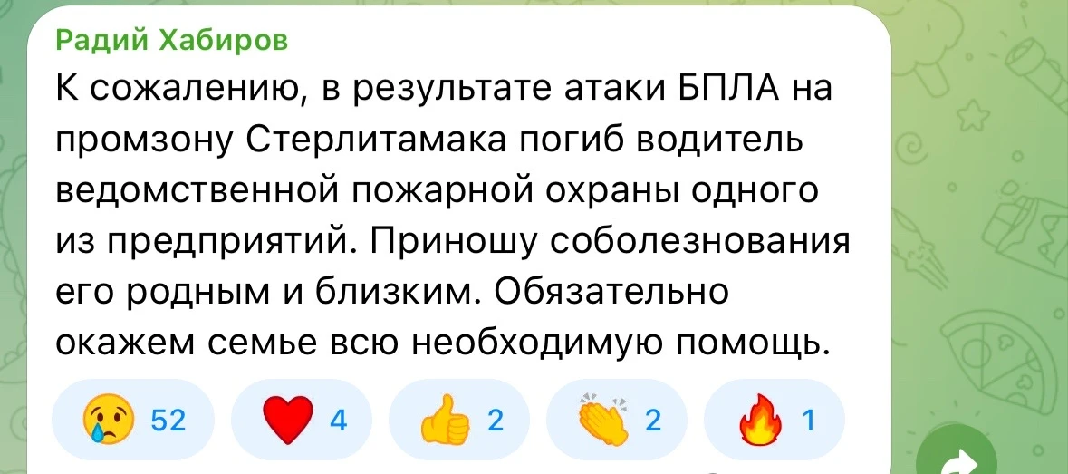⚡️В результате атаки вражеских БПЛА на промзону Стерлитамака погиб один человек, — глава региона Радий Хабиров.