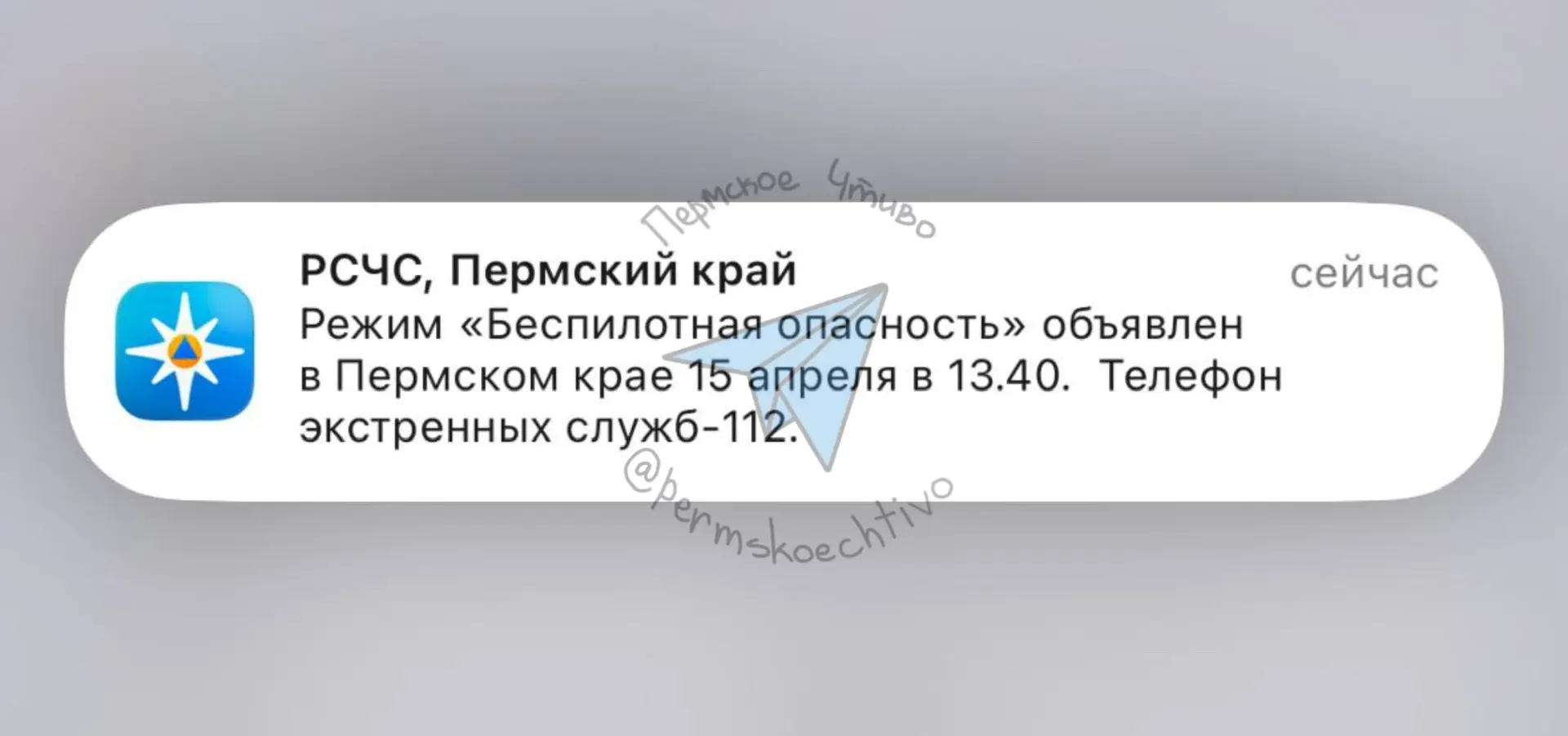 ⚡️Пермякам с большой задержкой начали приходить сообщения о введенном режиме «Беспилотной опасности».
