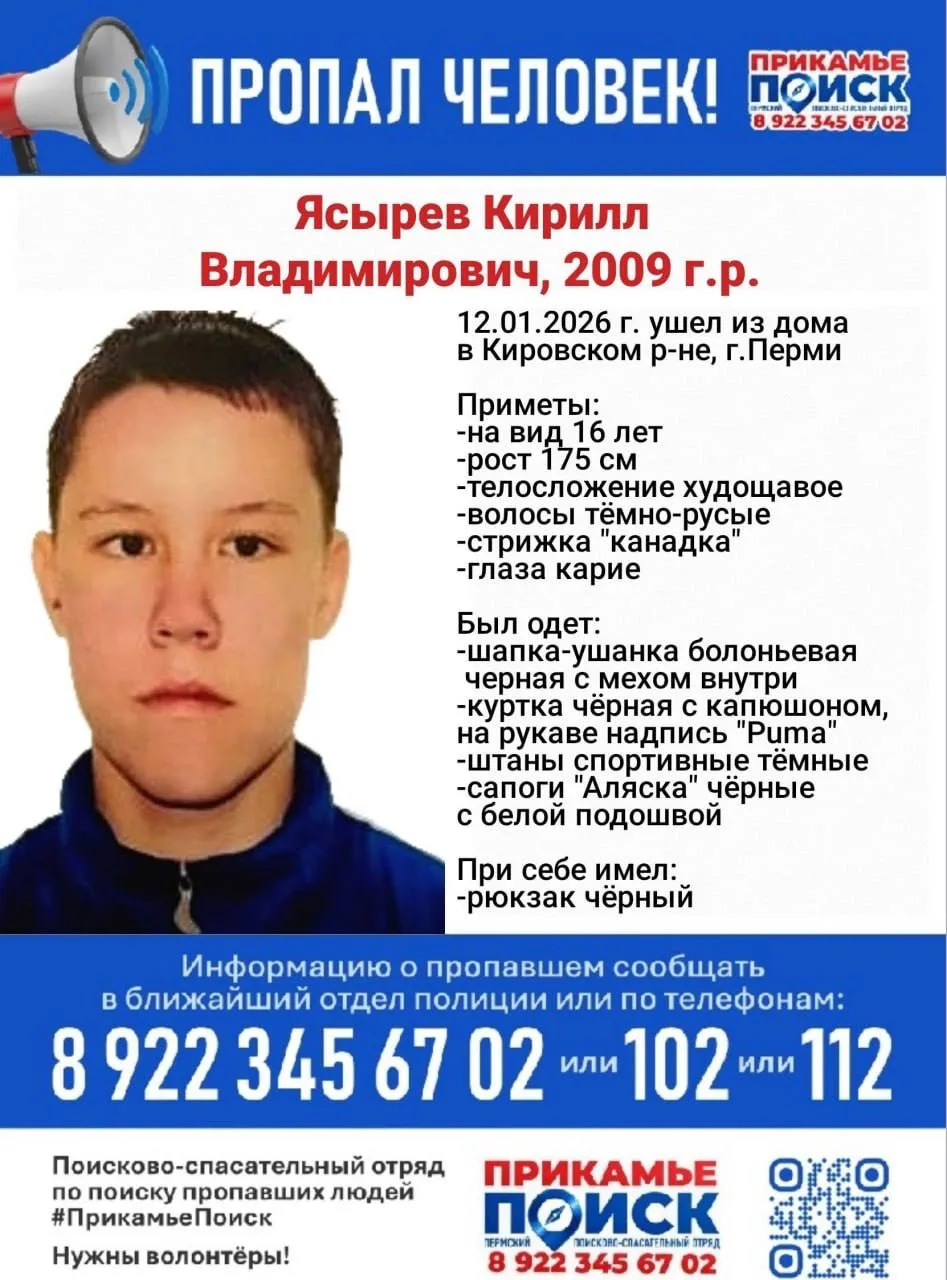 ⚡️В Перми разыскивают 16-летнего Кирилла Ясырева — подросток ушел из дома 12 января и не вернулся.