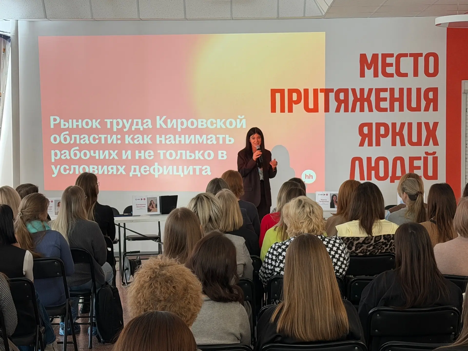 В числе приглашенных спикеров в течение года перед кировскими коллегами выступили специалисты hhветам.ru из Ярославля и Нижнего Новгорода. Они поделились своим видением трендов на рынке труда, сои по работе с разными типами соискателей, инструментами аналитики и отбора резюме.