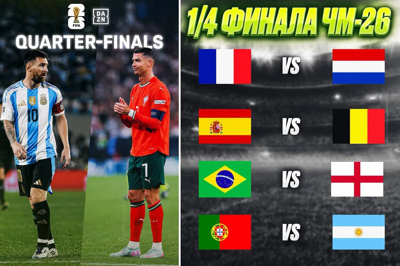 ❗️Месси и Роналду встретятся в 1/4 финала ЧМ-2026, если Аргентина и Португалия выиграют свои группы и пройдут стадии 1/16 и 1/8 финала. Если другие главные фавориты ЧМ также выиграют свои группы и не вылетят на ранних стадиях, то в Америке образуются самые сильные четвертьфиналы за всю историю чемпионатов мира по футболу: Франция – Нидерланды, Испания – Бельгия, Бразилия – Англия, Португалия – Аргентина