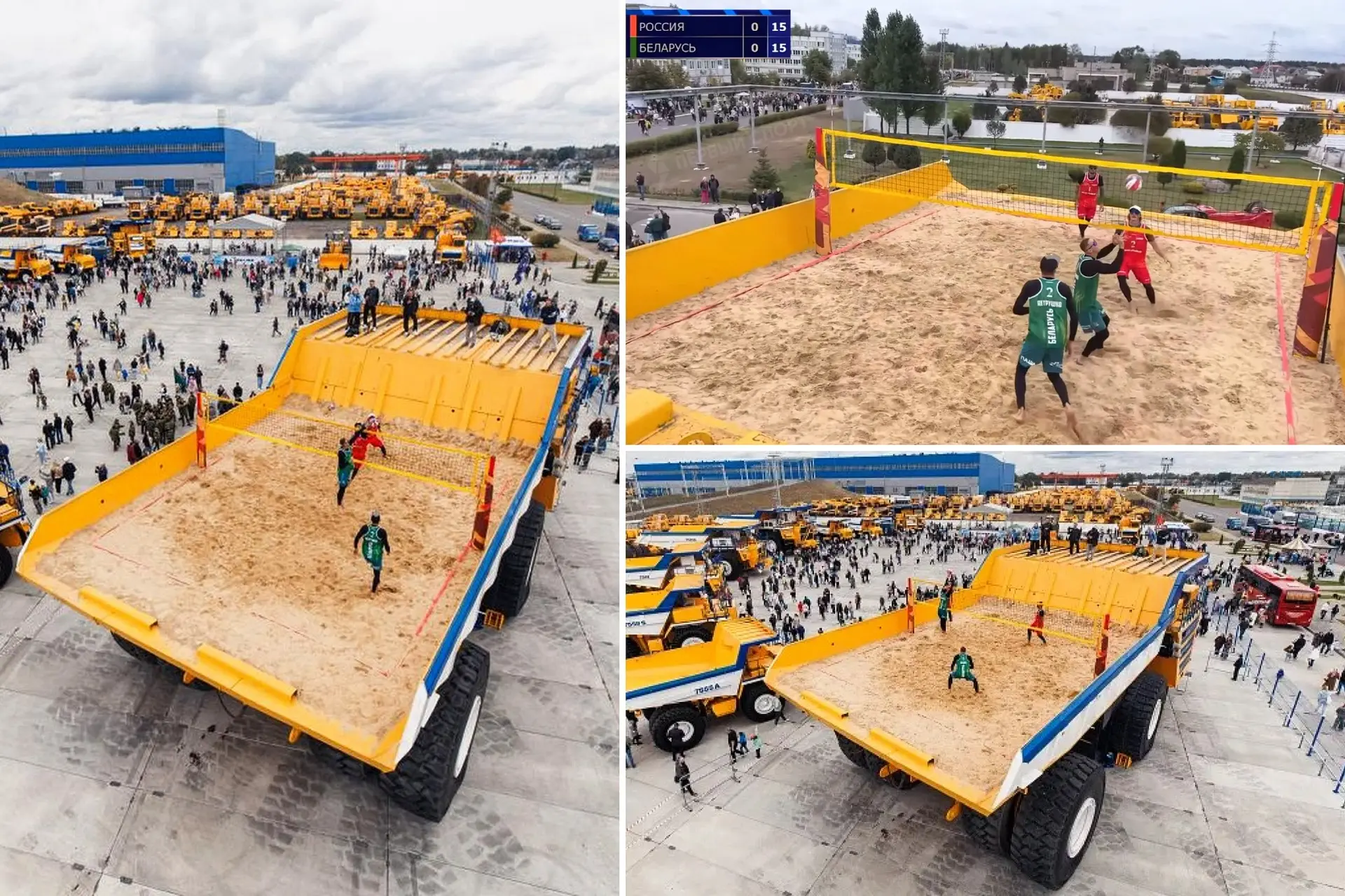 ❗️Россия и Беларусь сыграли в волейбол в кузове БелАЗа: уникальный выставочный матч прошёл под Минском в честь Дня машиностроителя в обеих странах. Площадку для игры в пляжный волейбол сделали прямо в кузове 450-тонного БелАЗа – самого большого самосвала на Земле высотой с трёхэтажный дом. Для создания корта в автомобиль с двигателем в 2300 л.с. насыпали 400 000 кг песка