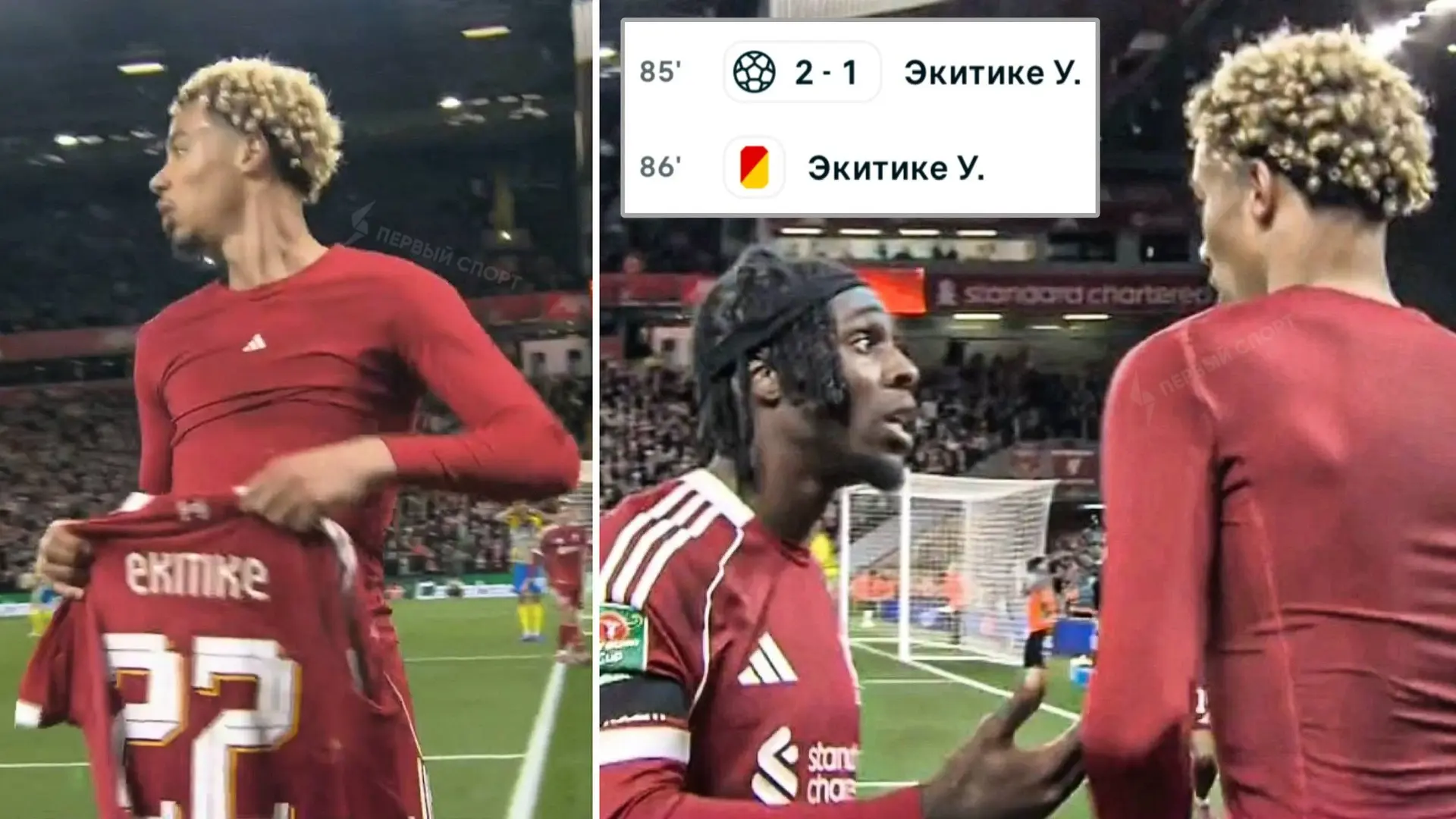 ❗️Экитике получил одну из самых нелепых красных карточек в истории: форвард «Ливерпуля» снял футболку после гола на 85-й минуте, но забыл, что у него уже есть жёлтая карточка. В итоге Экитике сразу получил вторую жёлтую и был удалён в матче Кубка лиги с «Саутгемптоном». Теперь Юго, купленный за 95 млн евро, пропустит игру с «Пэлас» в АПЛ: дисквалификация в Кубке распространяется и на лигу