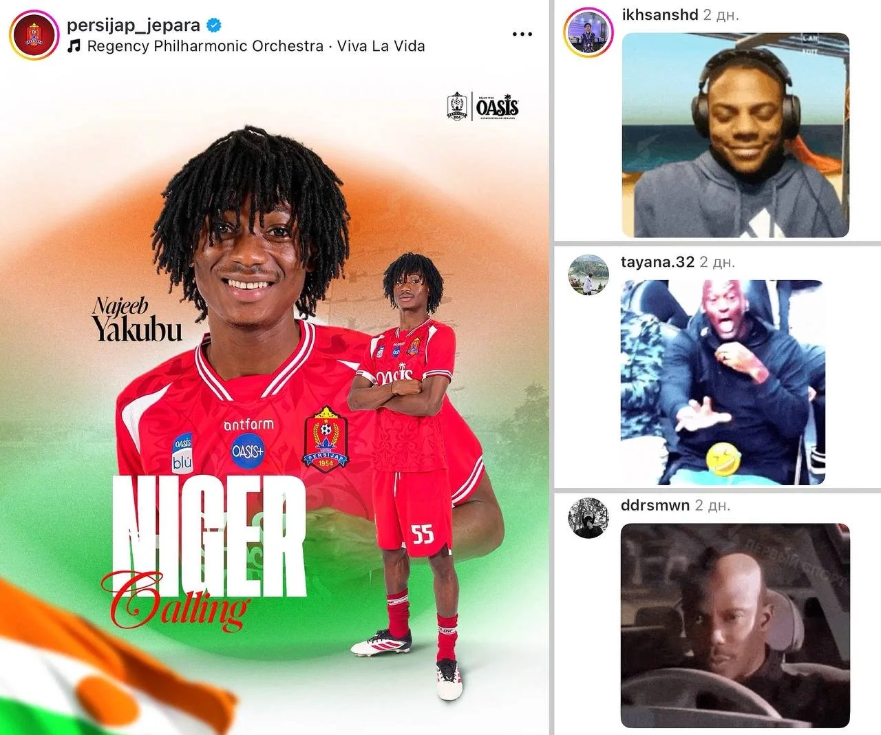❗️Индонезийский клуб написал слово «Нигер» огромными буквами на картинке со своим темнокожим игроком: так в «Персиджапе» решили объявить, что их футболист вызван в сборную Нигера на матчи отбора к ЧМ-2026. Шрифты на графике подобраны так, что слово «вызов» и имя вингера Наджиба Якубу не совсем видны, а слово «calling» можно перевести как «звонит». В итоге пост скромного клуба из Индонезии почему-то набрал несколько миллионов просмотров, а в комментариях спрашивают: «Зачем этот парень нам звонит?»