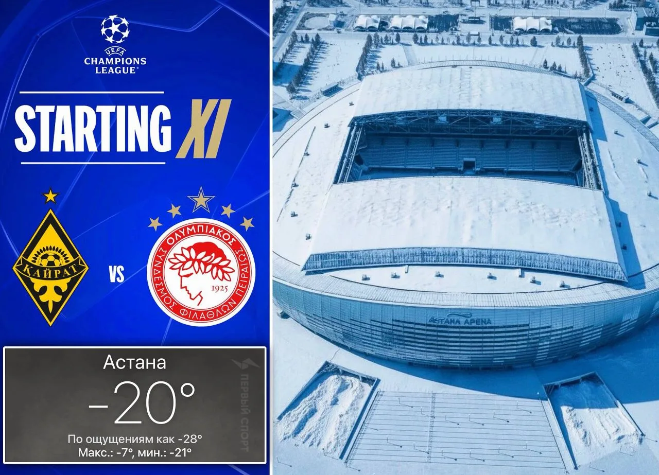 ❗️«Кайрат» и «Олимпиакос» играют в ЛЧ при -28°C: матч в Астане формально стал самым холодным за всю историю Лиги чемпионов. Игра проходит на стадионе с закрытой крышей, но греческие журналисты, игроки и болельщики «Олимпиакоса» всё равно в шоке от морозов на улице в столице Казахстана. При этом фактически матч перенесли из Алматы, где +2°C, в Астану, где температура ощущается как -28°C, из-за «плохих погодных условий» в Алматы. До этого одним из самых холодных матчей в истории ЛЧ была игра ЦСКА – «Реал»: в 2012 году температура в «Лужниках» опускалась до -11°C