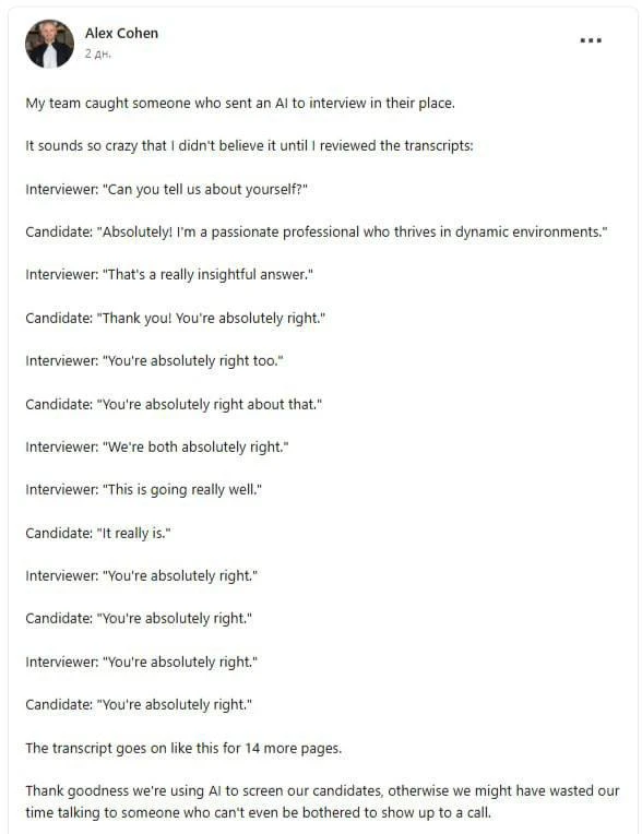 😏 «Черное зеркало» уже наступило: чел отправил ИИ-аватара на собес с ИИ-эйчаром