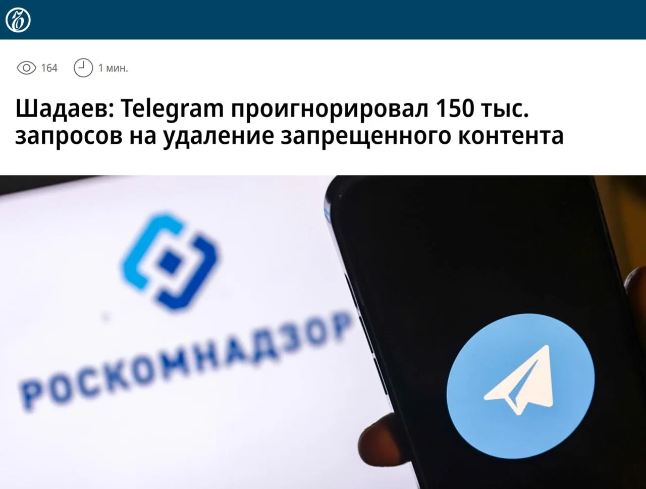 РКН применяет меры к Telegram из-за неудаления 150'000 запрещённых материалов — заявил глава Минцифры. По его словам, запросы ведомства мессенджер проигнорировал.