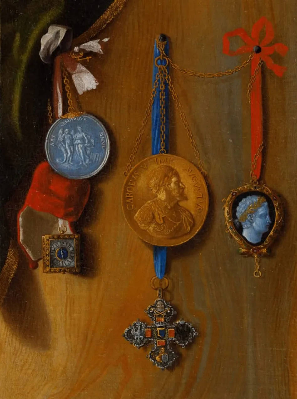 А может, это обман зрения? Перед нами натюрморт в жанре тромплей — скрупулезное изображение орденов, медалей и камеи с профилем древнеримского императора. Все это призвано обмануть зрителя, заставить поверить, что перед ним не живопись, а реально существующие предметы.