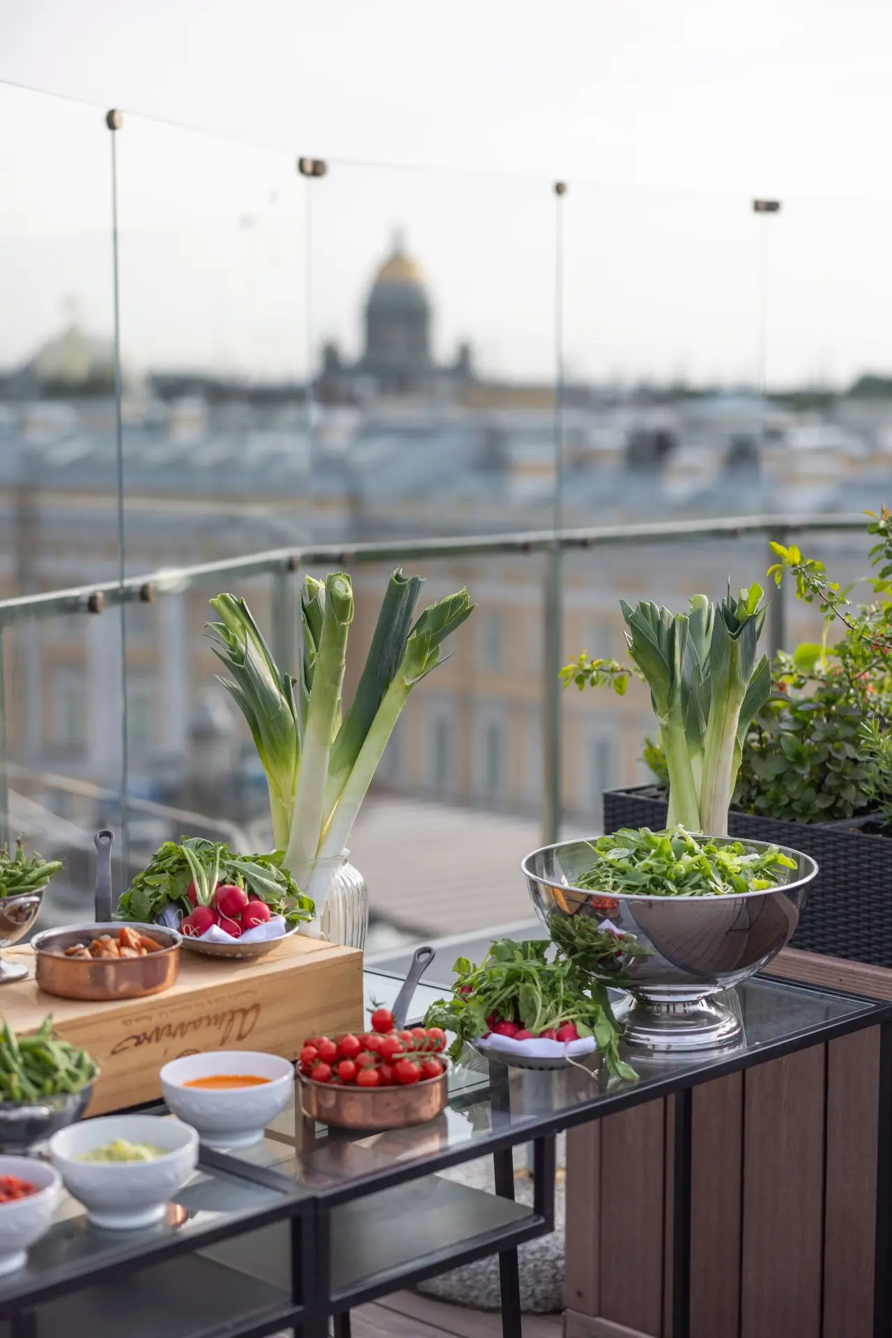 Торжественный гала-ужин в «Гранд Отеле Мойка 22» стал финалом прекрасного огородного сезона. Бренд-шеф ресторана Bellevue разработал уникальный авторский сет блюд из свежих продуктов, собранных на петровском огороде в Стрельне.