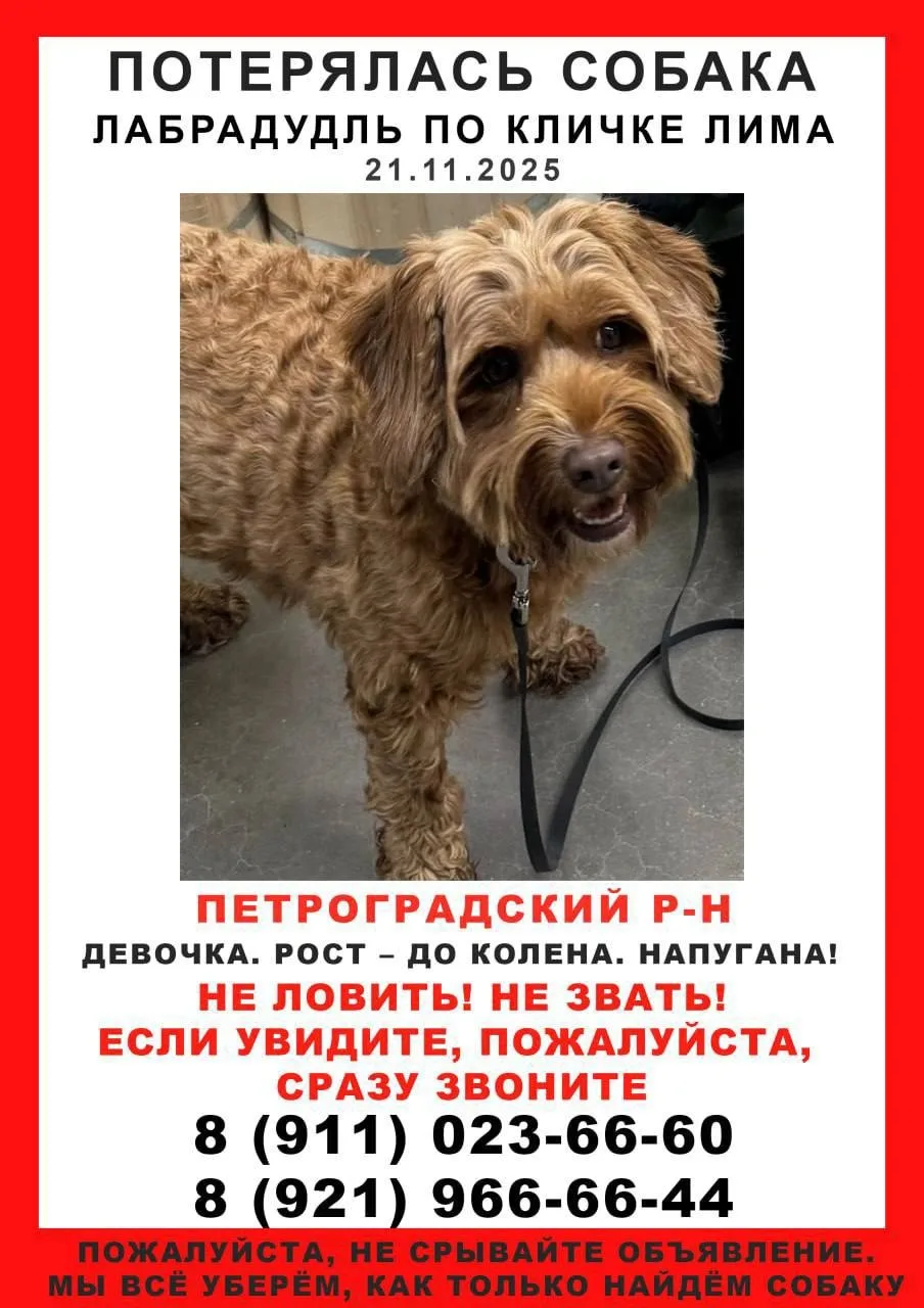 21.11 в 18:00 во время прогулки потерялась собака породы лабрадудель. Отстегнулся ошейник.
