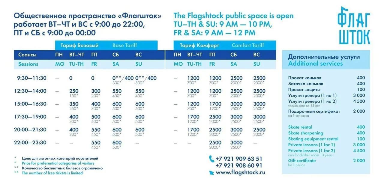 Кассы начнут работать 22 ноября. До 29 ноября каток работает не в полном режиме, поэтому на все сеансы действует скидка 15%, кроме комфорт-категорий и льготных билетов.