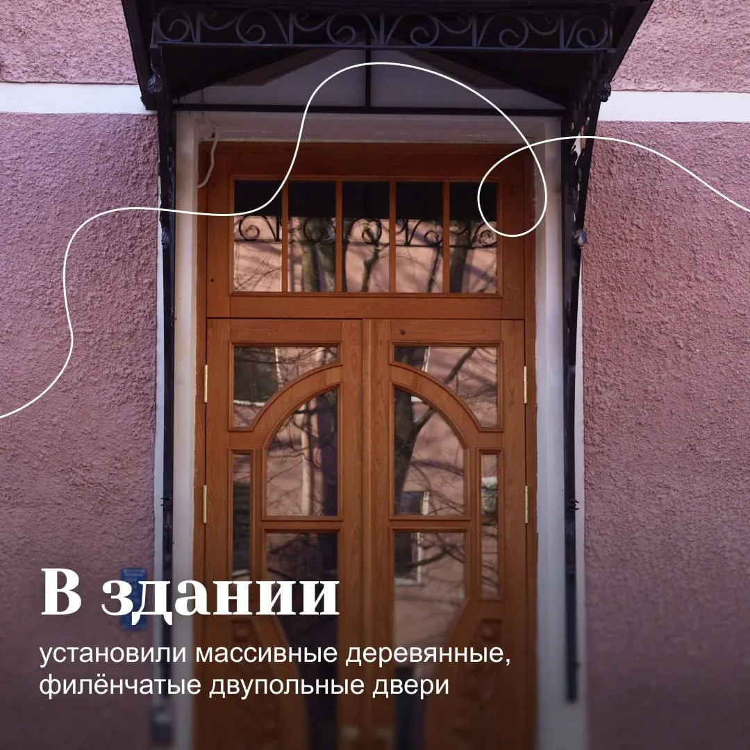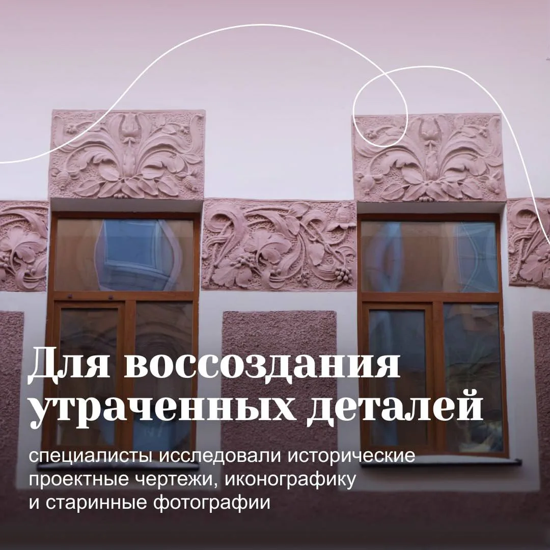 Специалисты вернули зданию уникальный лепной декор: восстановили «шубную» штукатурку, «пояса» с растительным орнаментом, красивое оформление оконных проемов и деревянные двери. Все работы вели с опорой на архивные чертежи и фотографии.