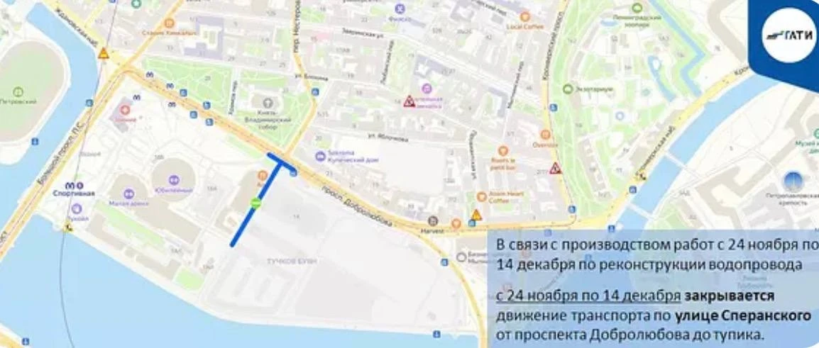 🚧 В Петроградском районе с 24 ноября по 14 декабря будет полностью закрыто движение транспорта по улице Сперанского от проспекта Добролюбова до тупика.