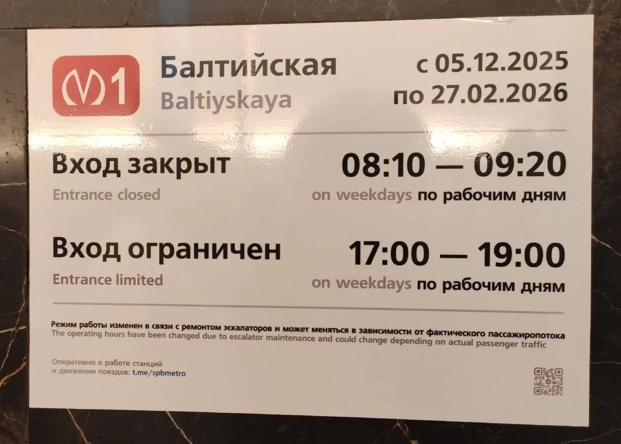❗️На станции метрополитена Балтийская начинается ремонт эскалатора. Работы продлятся с 5 декабря по 27 февраля и повлияют на режим входа в часы наибольшей загрузки.