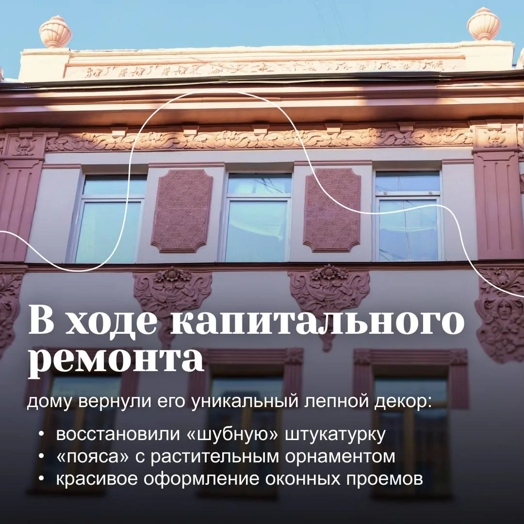 Зданию, построенному в 1905 году, вернули лепной декор, «шубную» штукатурку, растительный орнамент.