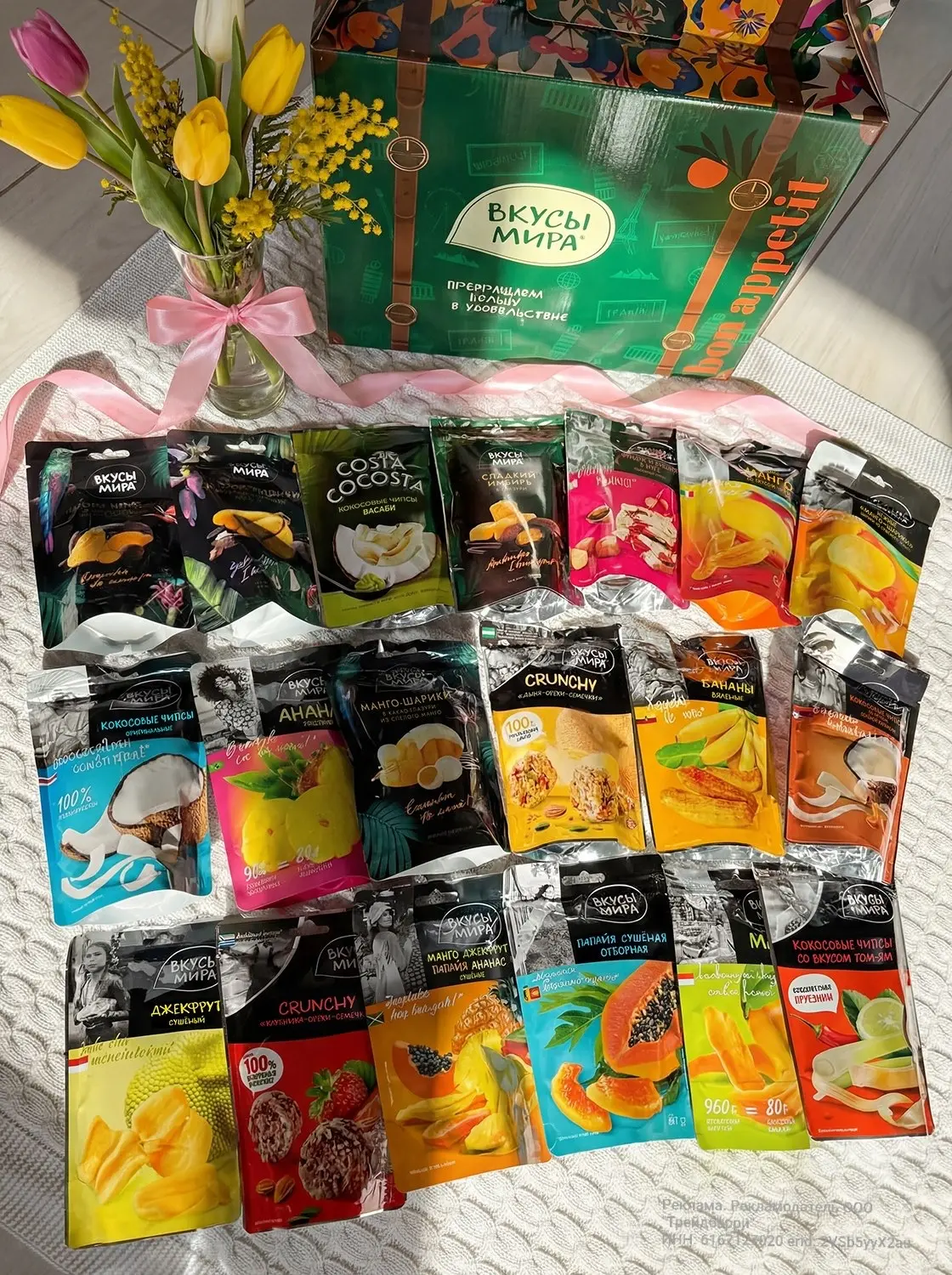 Внутри 18 вкусов -наше любимое манго, кокосовые чипсы, фрукты в глазури, ананас, папайя, чай...