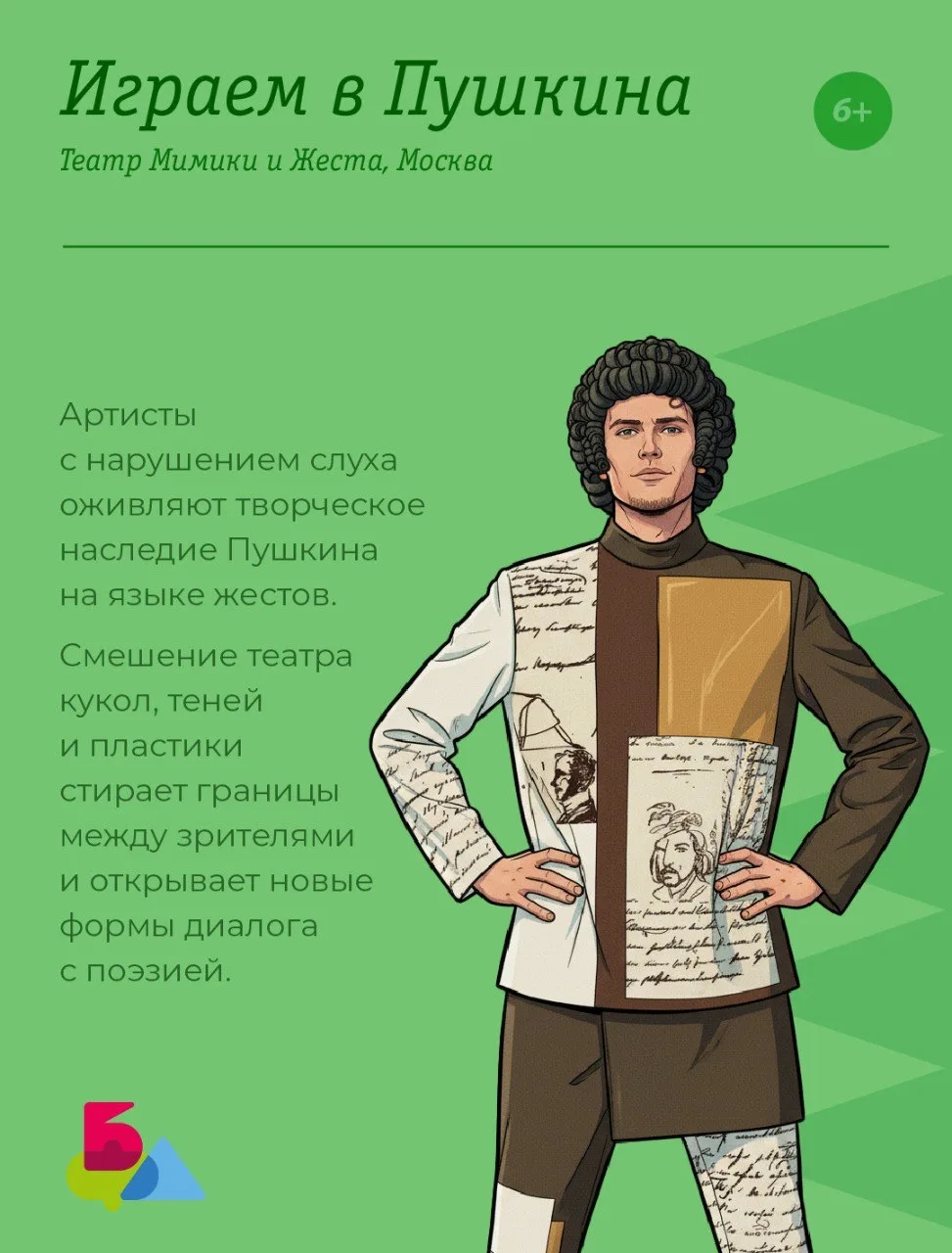 Главное событие — театральная программа. Коллективы со всей страны представят на сцене современное прочтение пушкинских сюжетов, шоу с гигантскими марионетками, музыкальные сказки. Программа подготовлена экспертами под руководством народного артиста Российской Федерации Сергея Безрукова, а выбор победителей традиционно остается за детско-юношеским жюри.