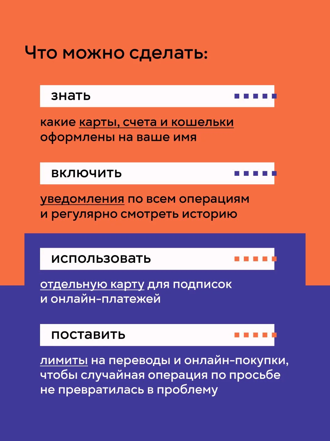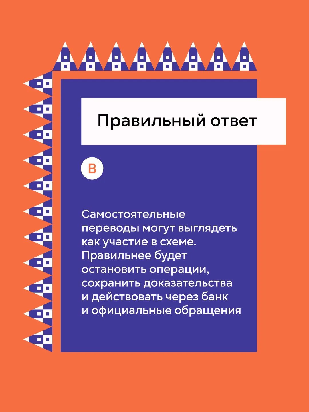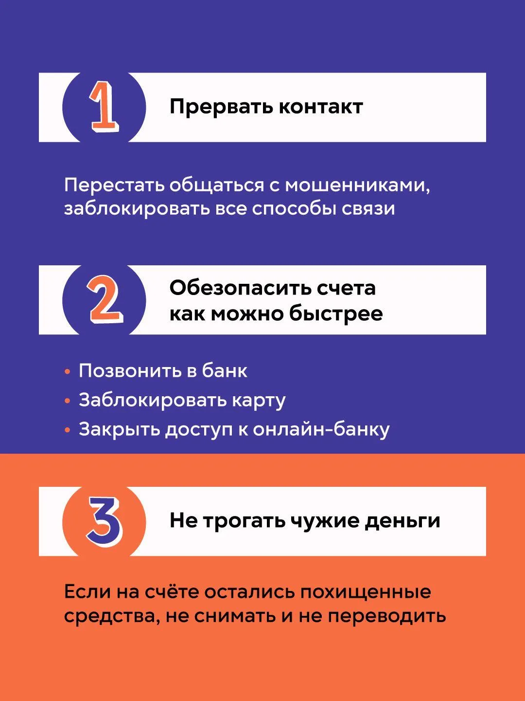 ✅ Не переводите свои деньги на счета третьих лиц, на так называемые «безопасные счета» — их не существует.