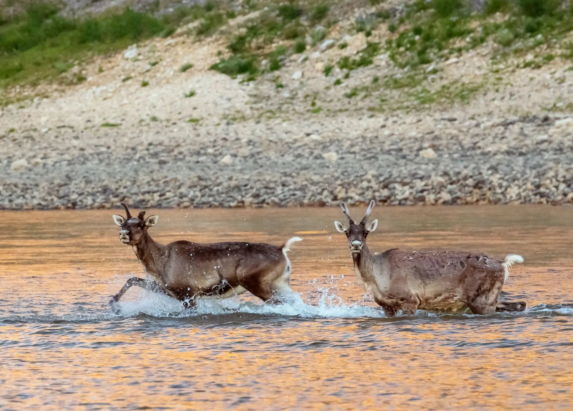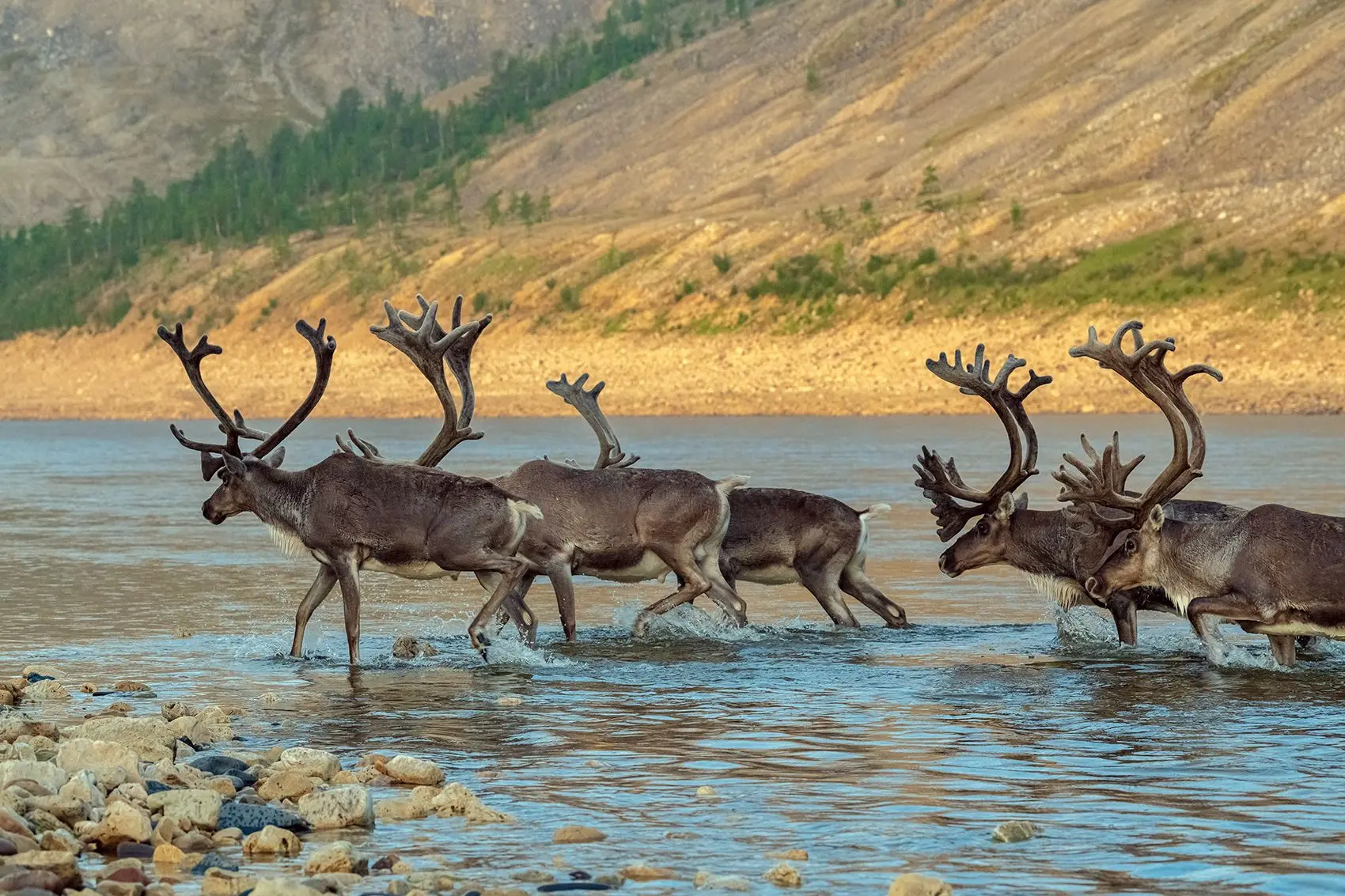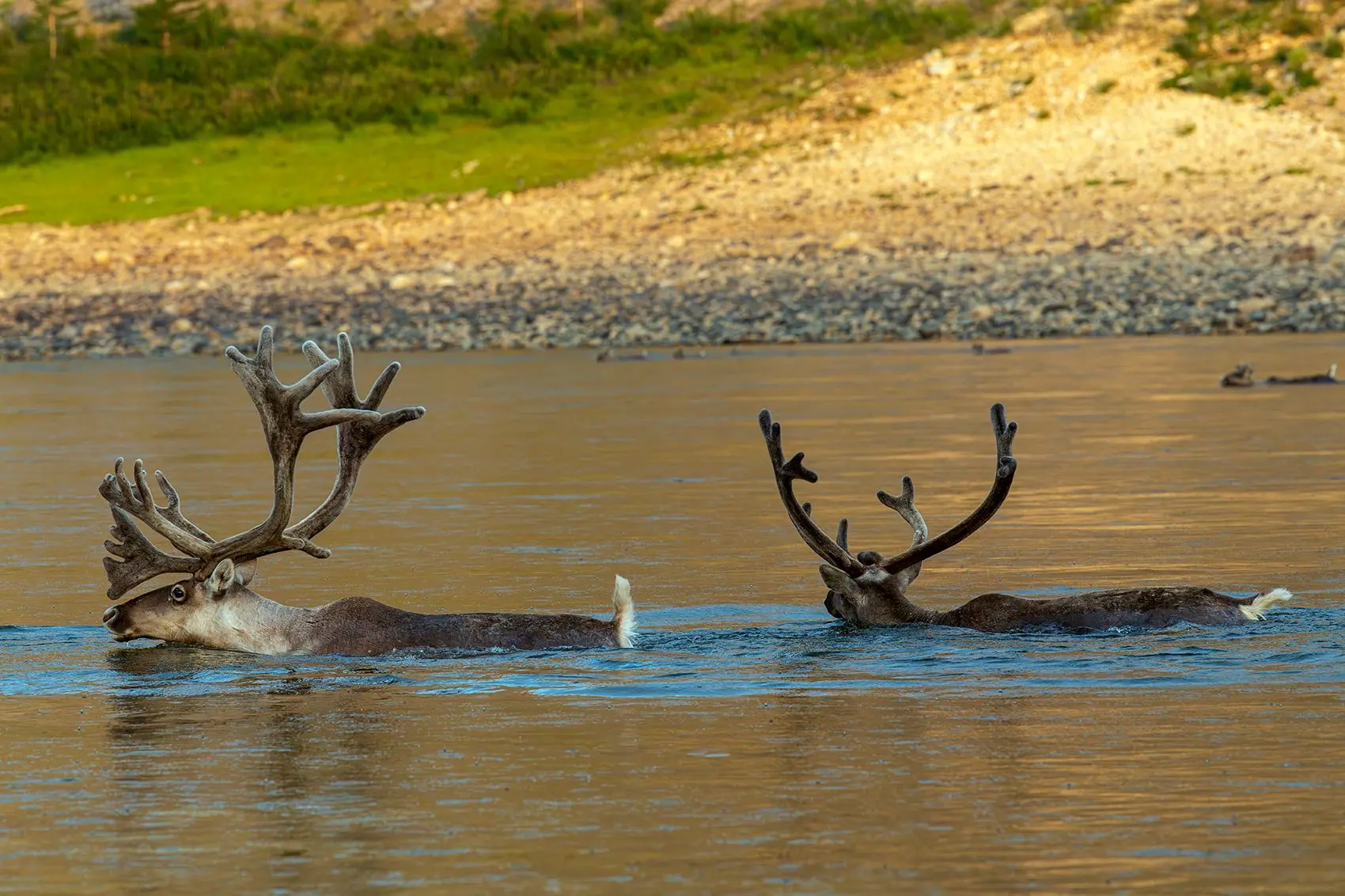 Они переходили на наш берег чуть дальше крайних палаток. Сначала на берег выходили крупные самцы с рогами, потом помельче, а потом самки с оленятами. Я постарался осторожно подобраться поближе и уселся на удобный камешек, занял позицию, не обращая внимания на то, что уже несколько промок. А они всё шли и шли, иногда практически в десяти метрах от меня, их было много, очень много. Некоторые косились на меня, а некоторые будто и не видели. Меня уже будто не существовало. Потом из палаток повылезали мои друзья и оленья идиллия была нарушена.