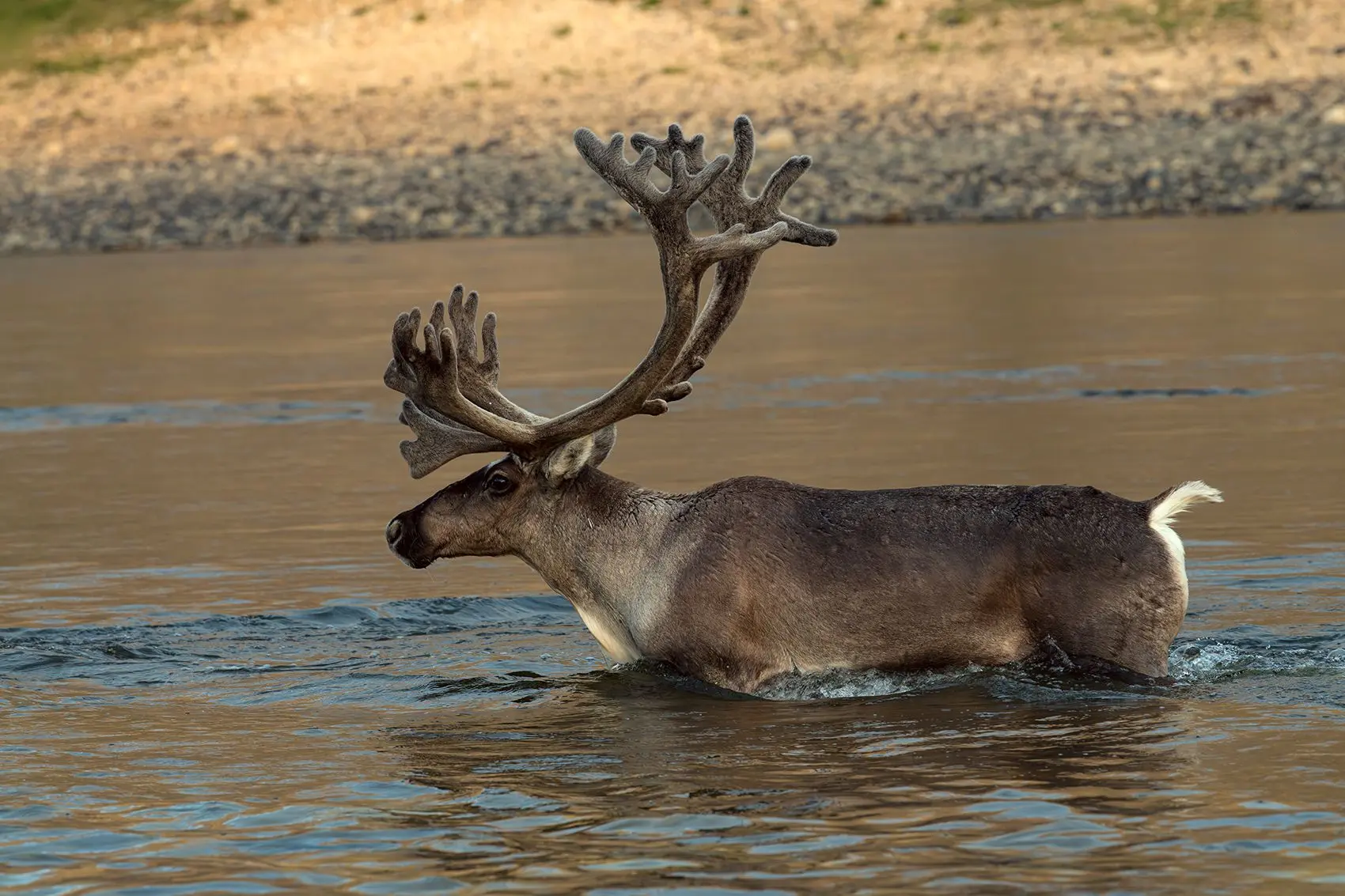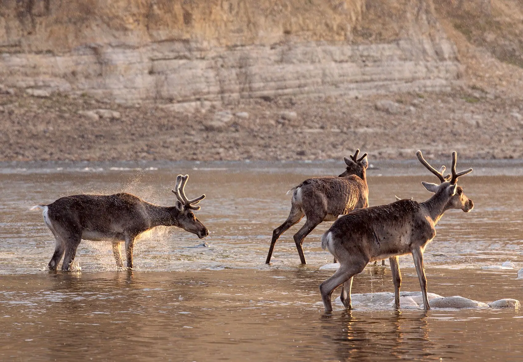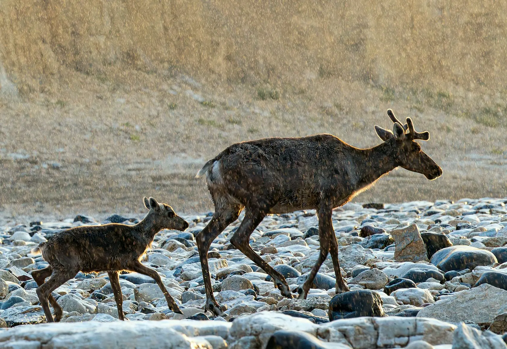Они переходили на наш берег чуть дальше крайних палаток. Сначала на берег выходили крупные самцы с рогами, потом помельче, а потом самки с оленятами. Я постарался осторожно подобраться поближе и уселся на удобный камешек, занял позицию, не обращая внимания на то, что уже несколько промок. А они всё шли и шли, иногда практически в десяти метрах от меня, их было много, очень много. Некоторые косились на меня, а некоторые будто и не видели. Меня уже будто не существовало. Потом из палаток повылезали мои друзья и оленья идиллия была нарушена.
