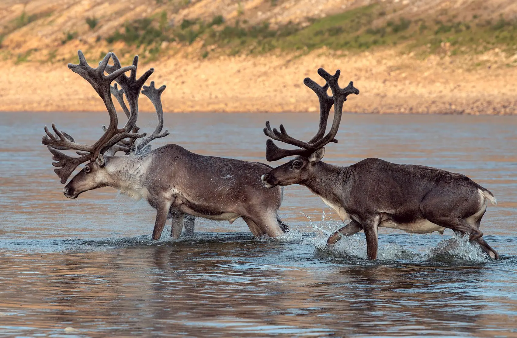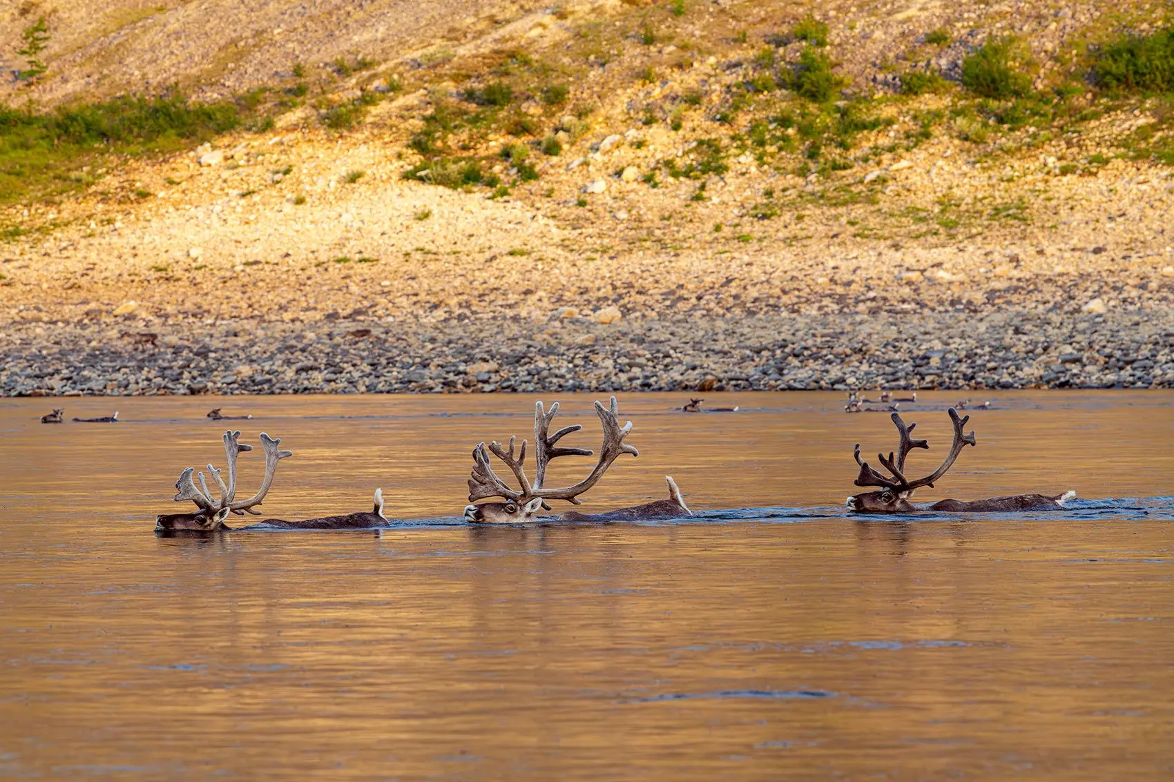 Пошли олени. Пошли большими группами, с другого берега переплывая огненную, горящую в свете восходящего солнца реку на наш берег, и уходили в сторону леса. Мне хотелось бросить дрон, пу