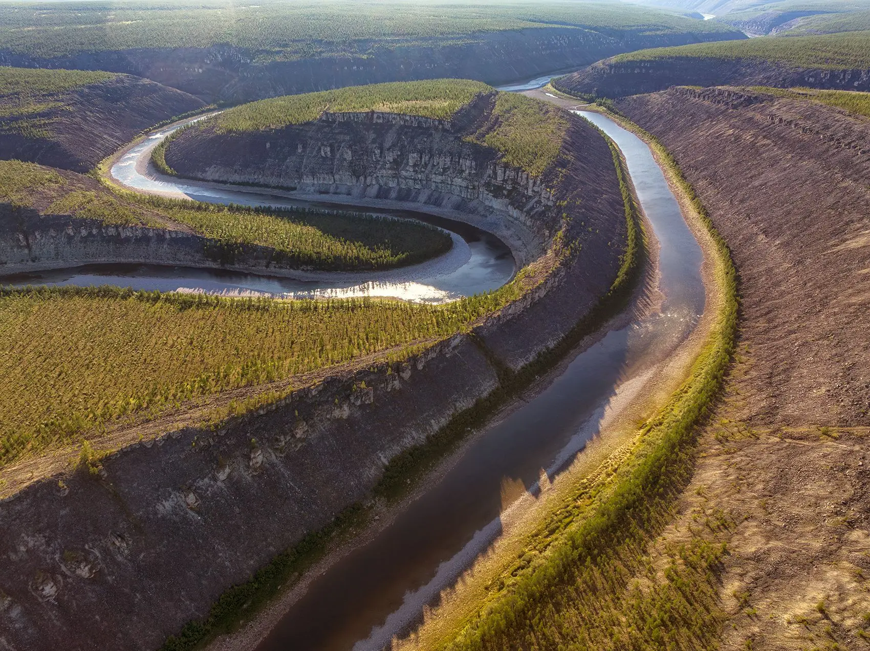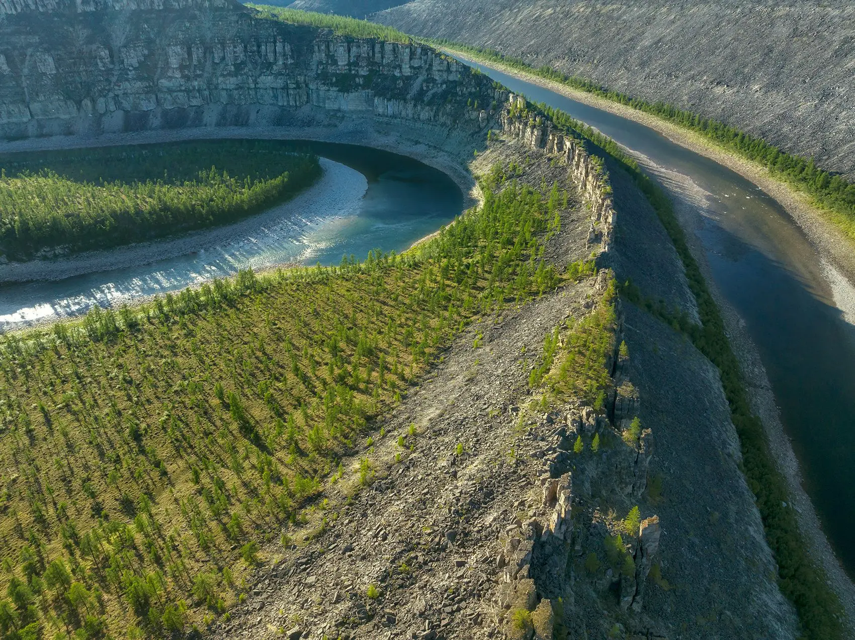 Анабарское плато, река Котуйкан. Самое характерное место на реке там, где в неё впадает левый приток Джогджо. Не так далеко выше устья, Джогджо вплотную подходит к Котуйкану и будто упирается в неприступную стену. Потом отступает, делает петлю и чуть дальше всё же впадает в него. Вот интересно, сколько ещё веков потребуется, чтобы приток пробился через эту стену к основной реке. Но это неминуемо когда-то произойдёт.