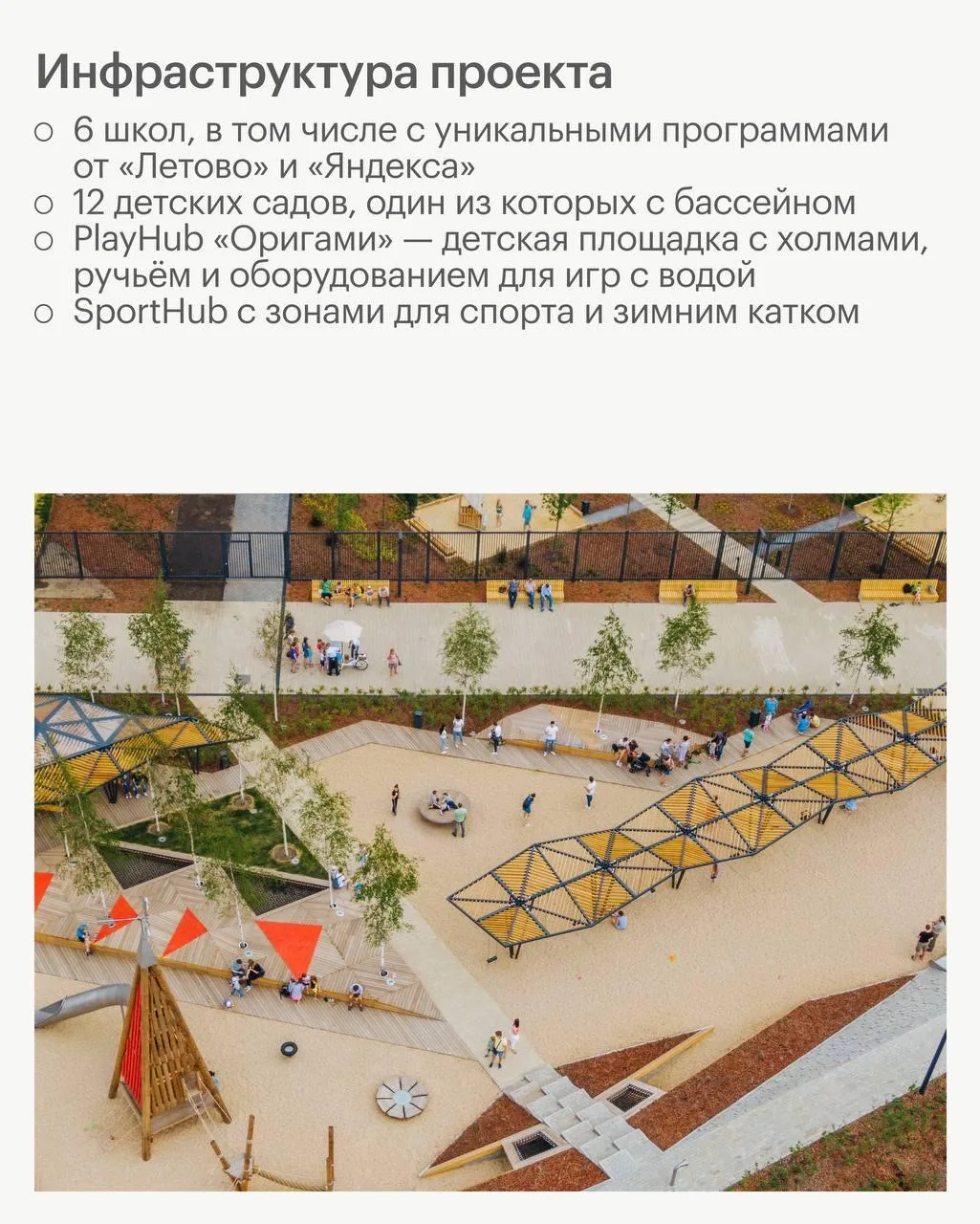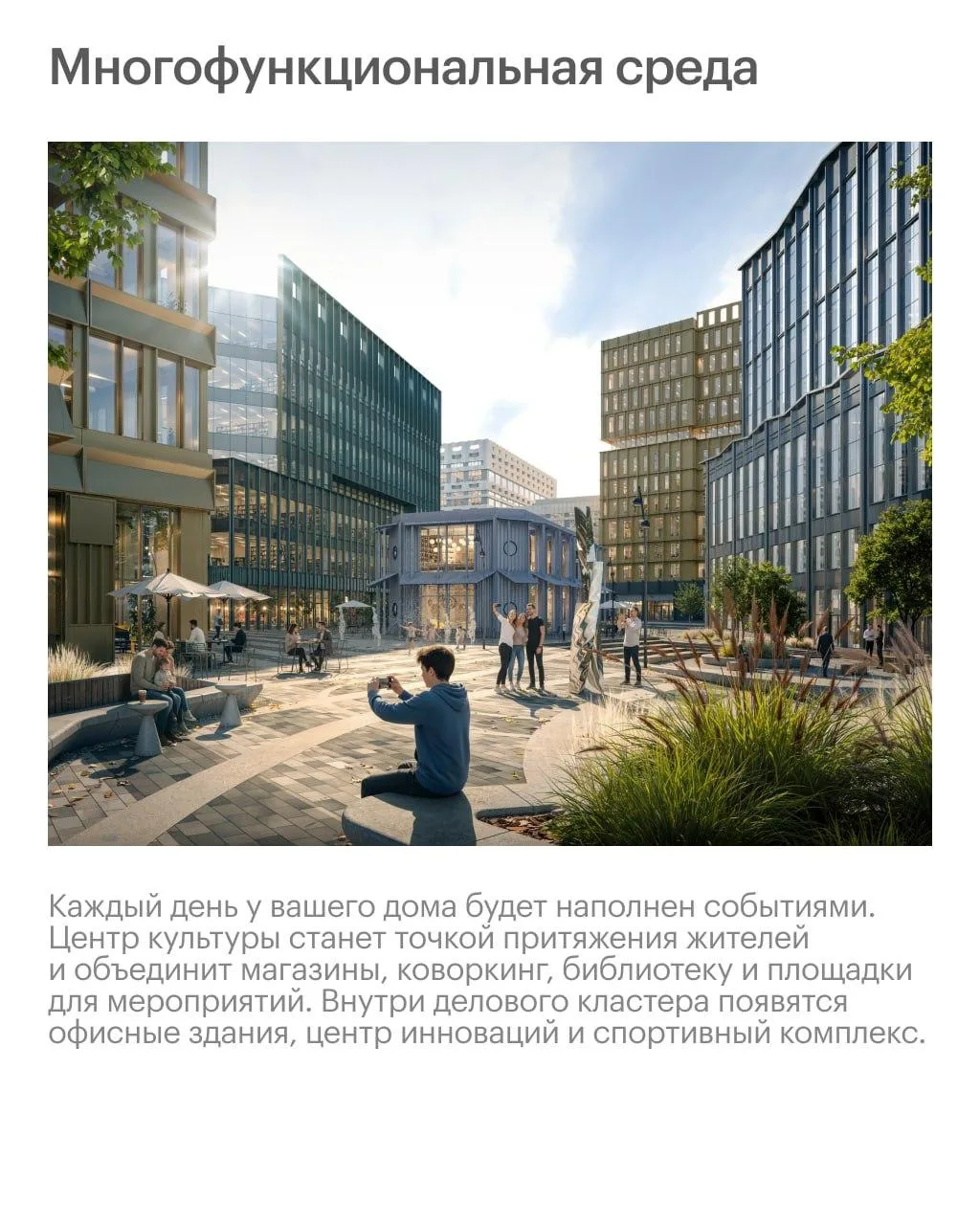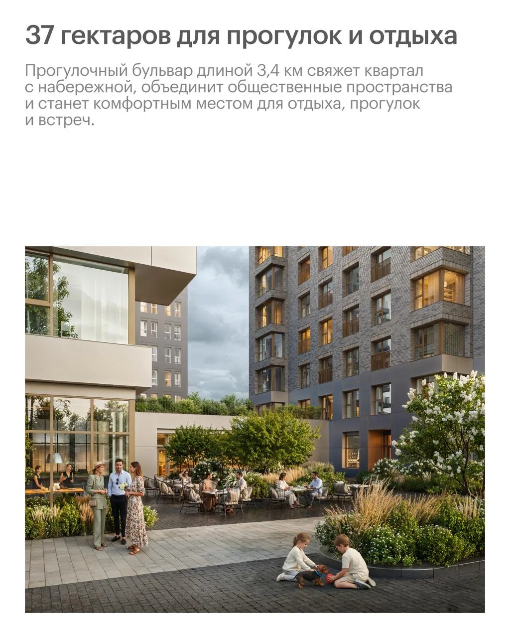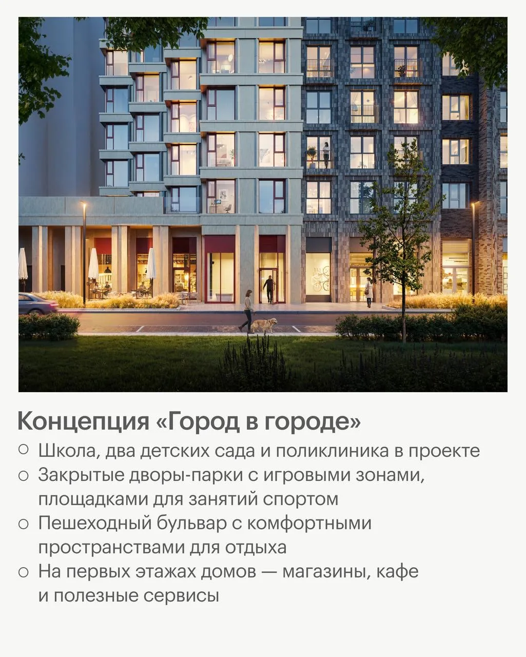 Квартал находится в окружении парков и отличается разнообразным благоустройством. Здесь появятся пространства для игр и спорта, комплекс с бассейном, пешеходный бульвар для прогулок, современные детский сад, школа и поликлиника.