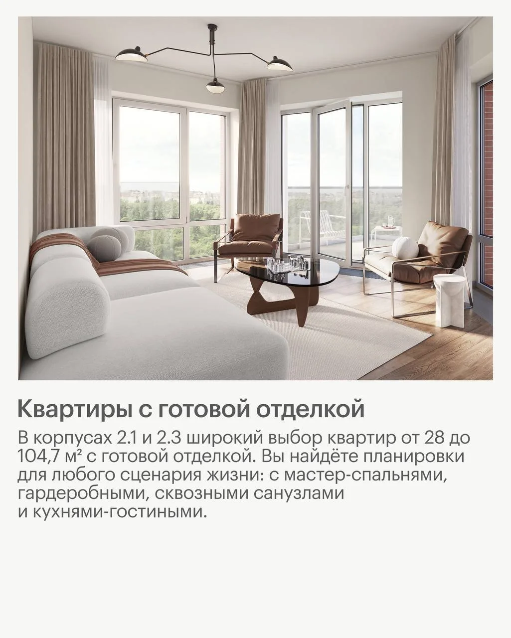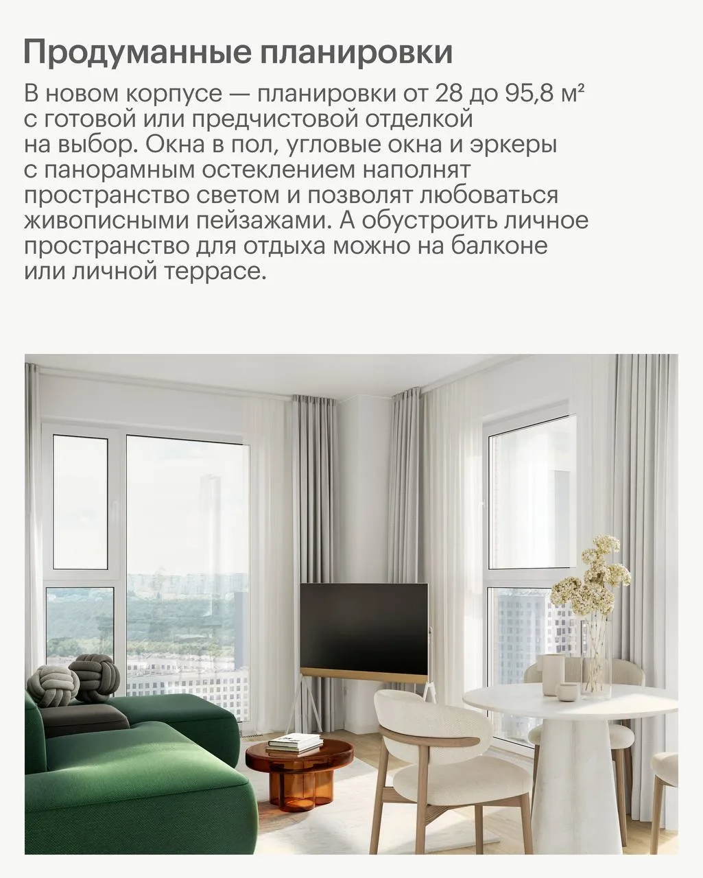 Квартиры «Серии плюс» созданы для таких моментов. Просторная кухня-гостиная с удобной планировкой — для кулинарных экспериментов и домашних киносеансов с друзьями. Панорамные окна — чтобы видеть город во всём его многообразии: рассветы, закаты, вечерние огни. А терраса — чтобы задержаться с чашкой кофе и встретить утро.