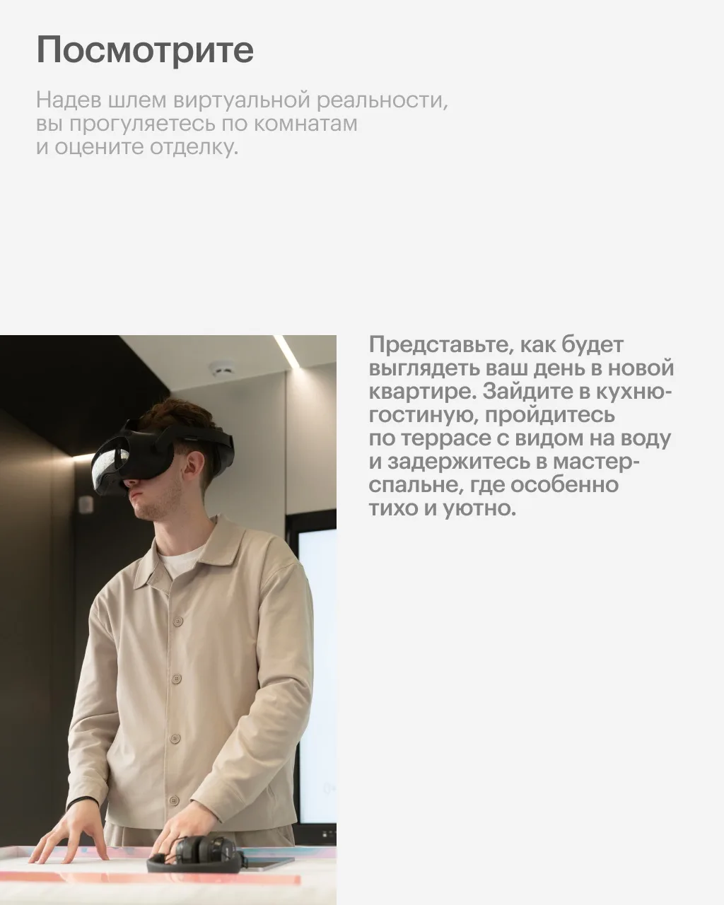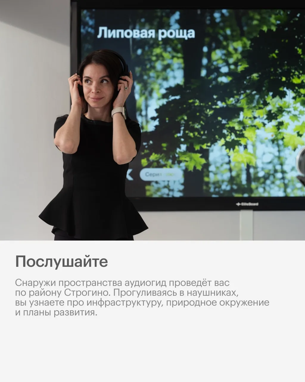 С помощью технологий виртуальной реальности здесь можно услышать, увидеть и ощутить атмосферу проекта. А также осмотреть планировки, которые легко адаптируются, заглянуть в гранд-лобби и послушать аудиогид во время прогулки по Строгино.