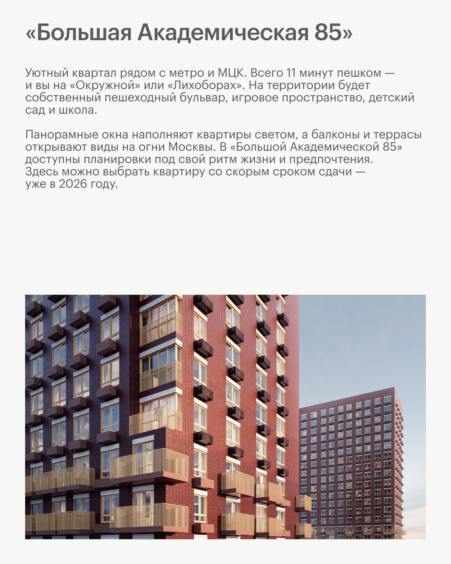 Проект расположен в районе с богатой историей и отличной транспортной доступностью: до метро «Бутырская» — 3 минуты пешком, до ТТК на машине — 5 минут.