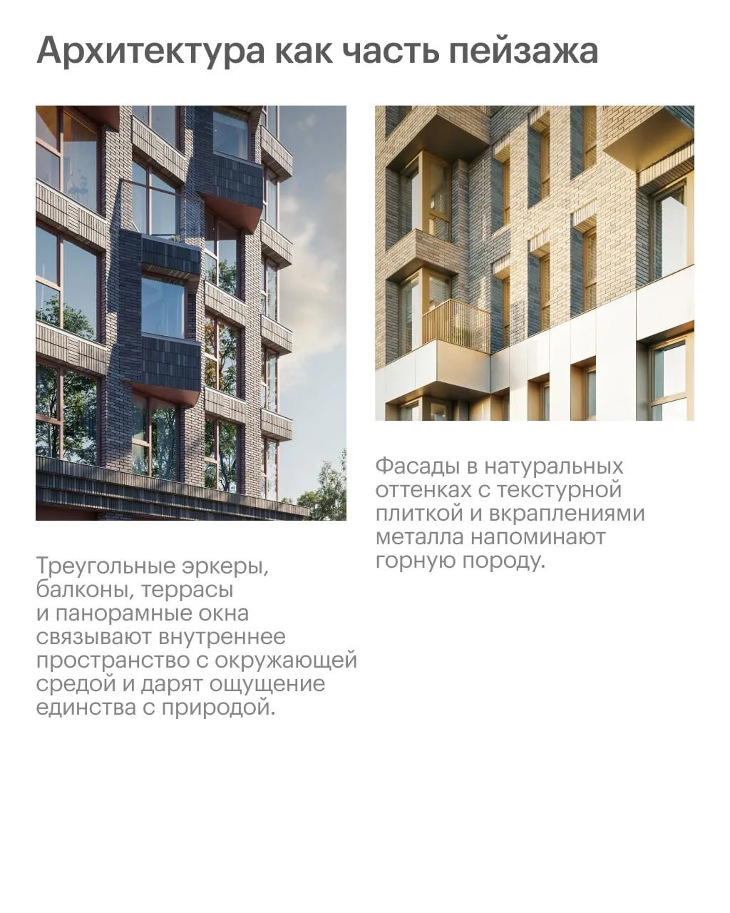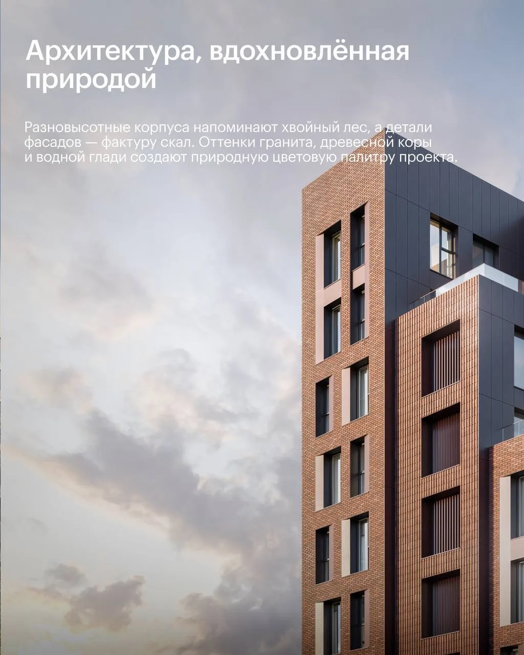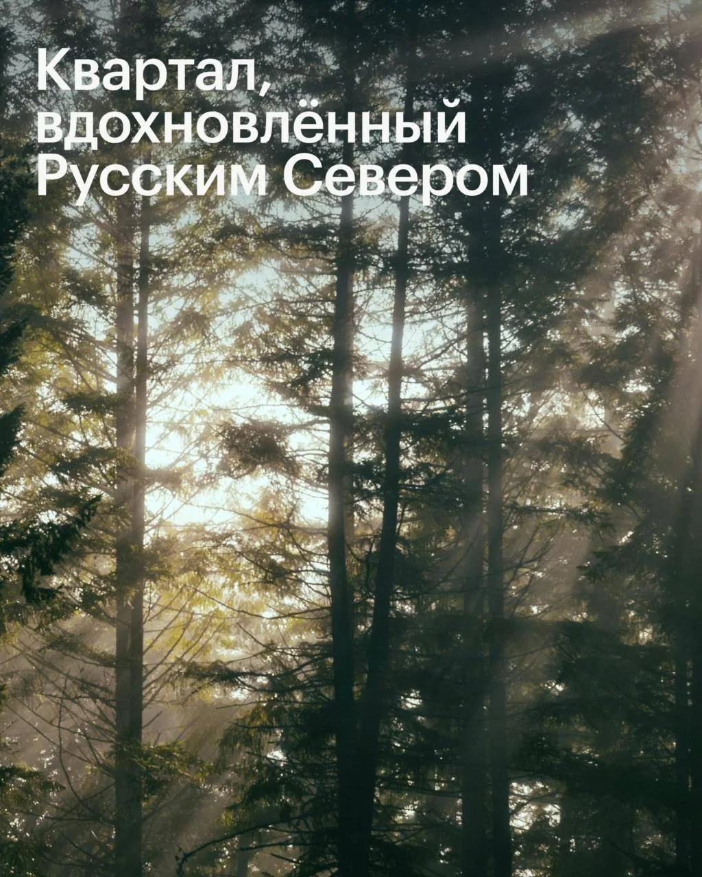 Архитектура проекта навеяна природой. Разновысотные здания повторяют живописные линии северных скал и высоких хвойных деревьев. Они наполняют пространство квартала атмосферой Русского Севера.