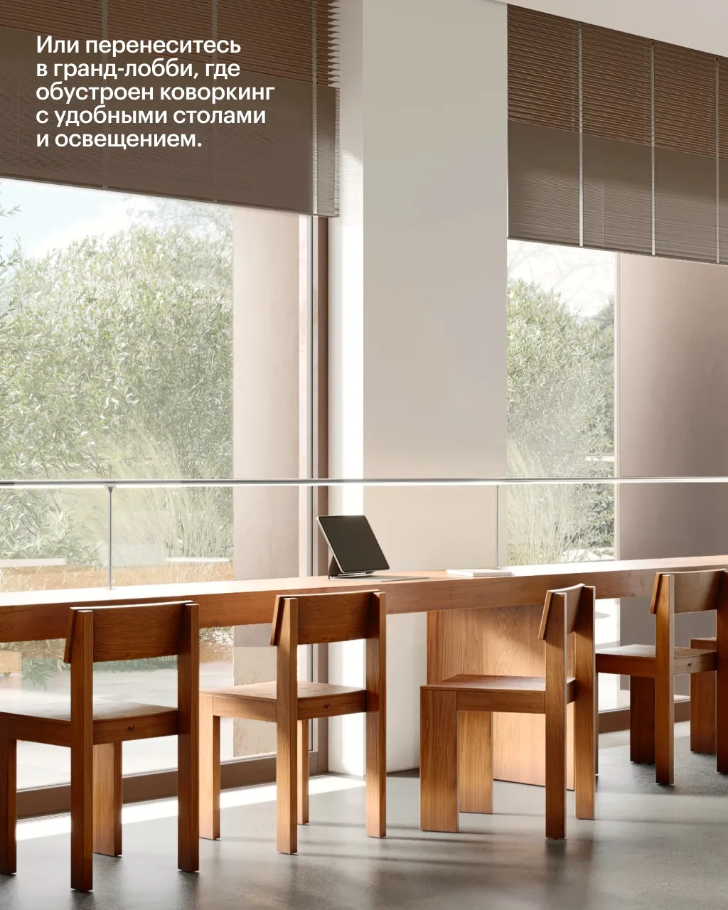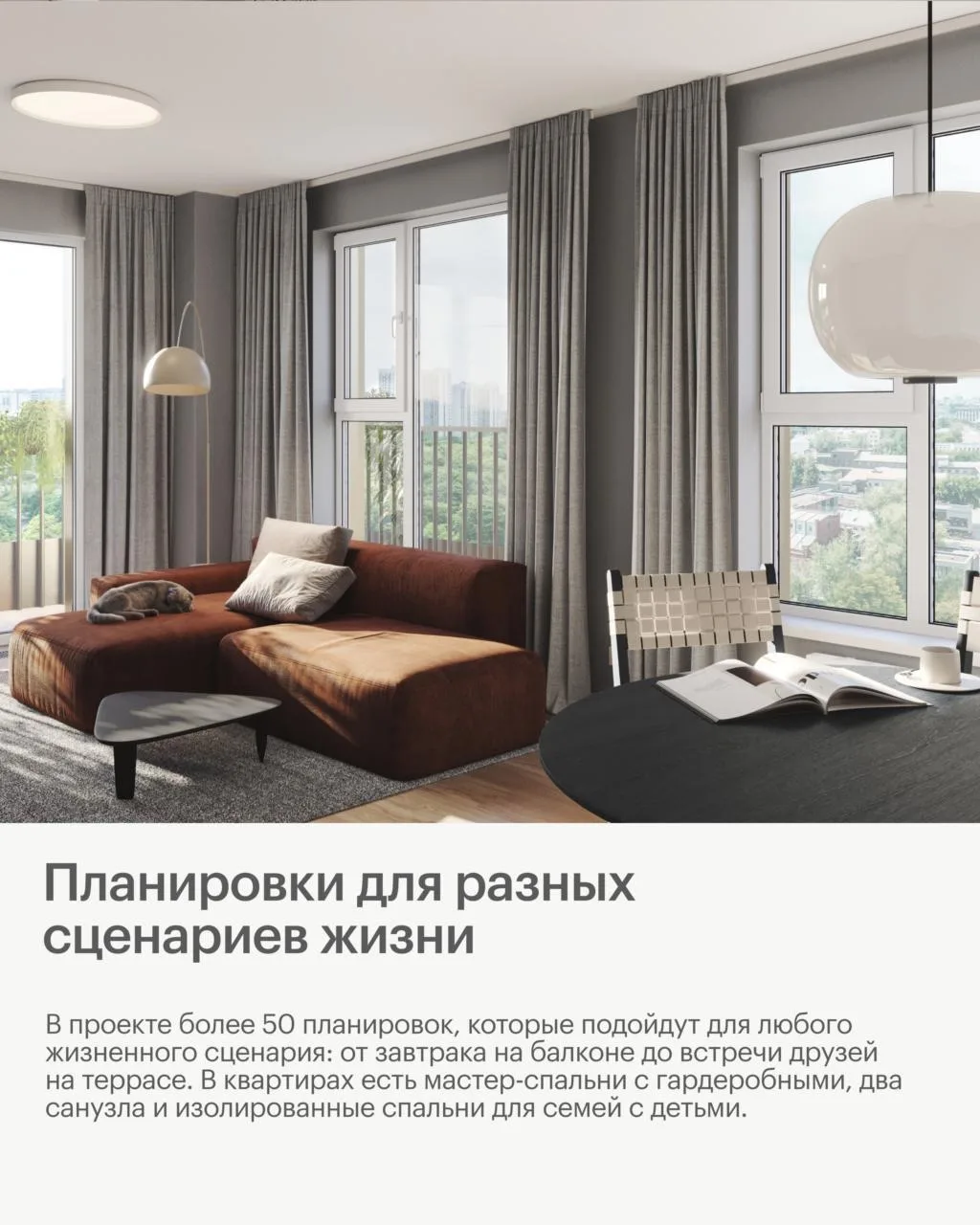 Окна в пол визуально расширят пространство комнат, а в тёплое время года терраса или открытый балкон станет идеальным местом для занятий йогой, завтраков под открытым небом или встреч с друзьями.