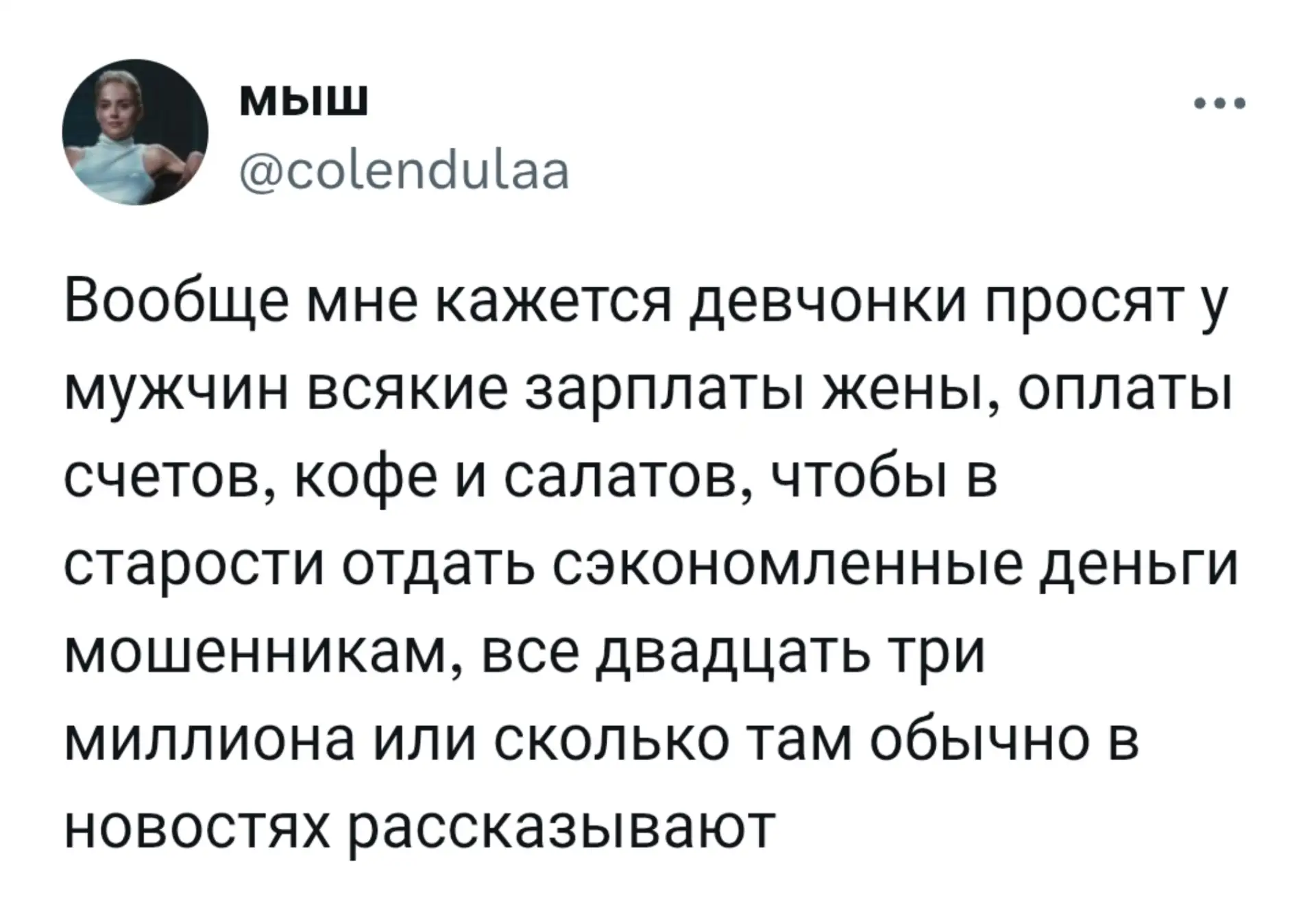 Коллега-девушка на это отвечает: «Ну не мой вайбик, я это чувствую». И, с одной стороны, ее можно понять. А с другой стороны, х&^и ты ноешь тогда каждый день, что тебя замуж никто не зовет в твои 27 лет?