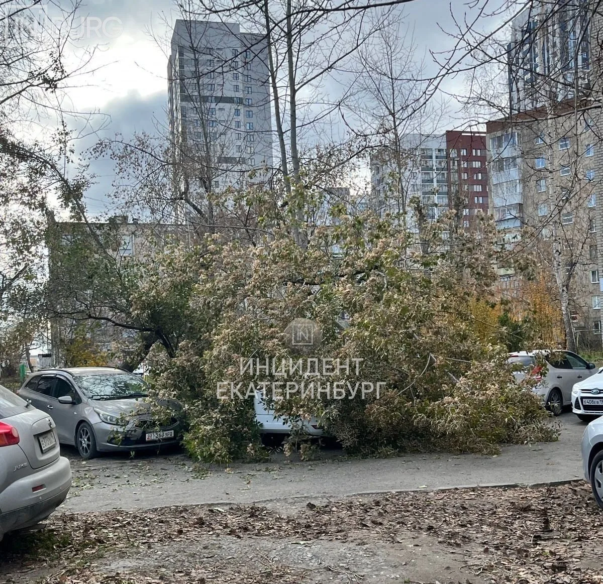 Во дворе на Раевского, 14А из-за сильного ветра тополь рухнул на автомобили.