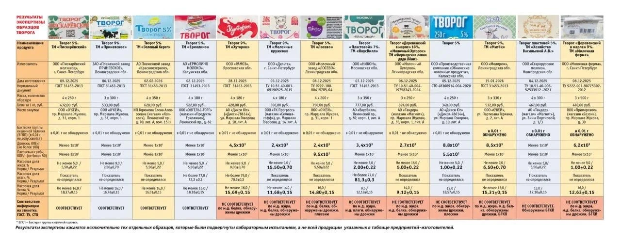 Творог «Пискарёвский», «Зеленый берег», «Приневское» и «Ермолино» прошёл проверку успешно.