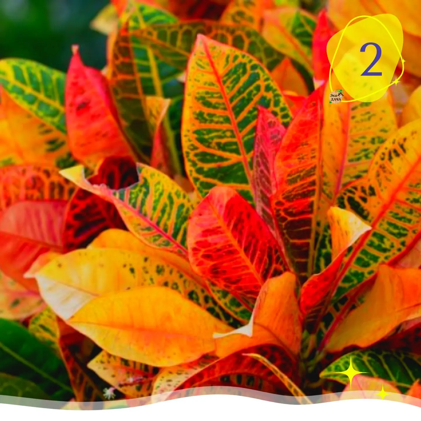 2️⃣ Кодиеум — листья с узорами ярких оттенков: жёлтые, красные, зелёные. Требует солнечного света и влажного воздуха.