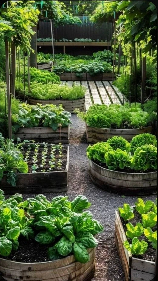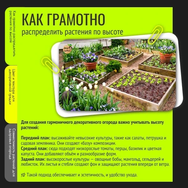 🥗 Низкие культуры, как салаты и петрушка, — на передний план.