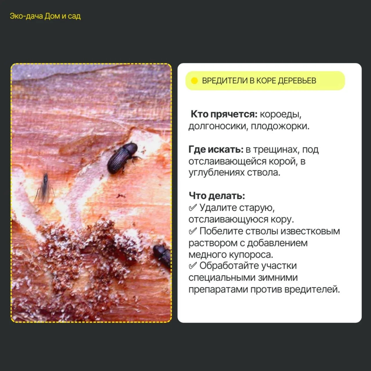 1️⃣ Очистка коры – удалите старую кору и мох, где прячутся долгоносики.